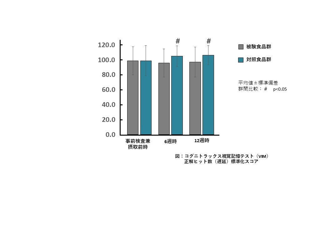 ※3 視覚記憶テスト(VIM)正解ヒット数(遅延)とは、「図形の記憶認知機能」を測定するためのテストである。このテストでは、最初に画面に15種類の図形が表示される。その後、被験者は別の試験に取り組み、一定時間経過した後に、新たに提示される15の図形の中から、先に表示された図形を見つけ出すことが求められる。