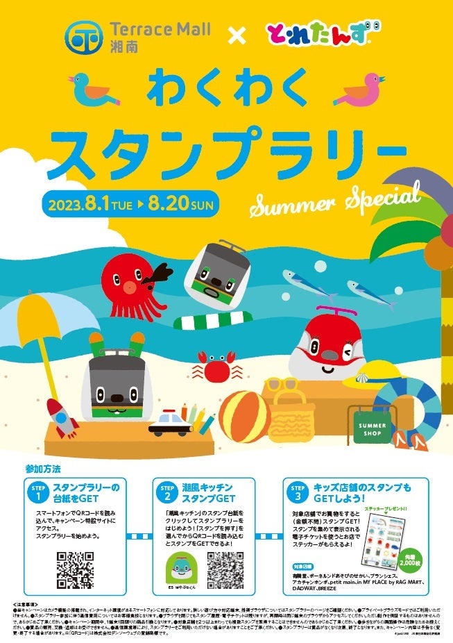 8月1日(火)より、JR東日本の列車をモチーフにした新幹線と仲間たち・とれたんずとコラボレーションしたデジタルスタンプラリーを開催。期間中、対象店舗と潮風キッチン内にスタンプを取得できるスポットを設置。潮風キッチン内のスポットは誰でもスタンプを取得でき、対象店舗ではお買い物をすると(金額不問)スタンプを取得できます。スタンプを集めると、ここでしか手に入らない、とれたんずのオリジナルステッカー(先着2000枚)をプレゼント。