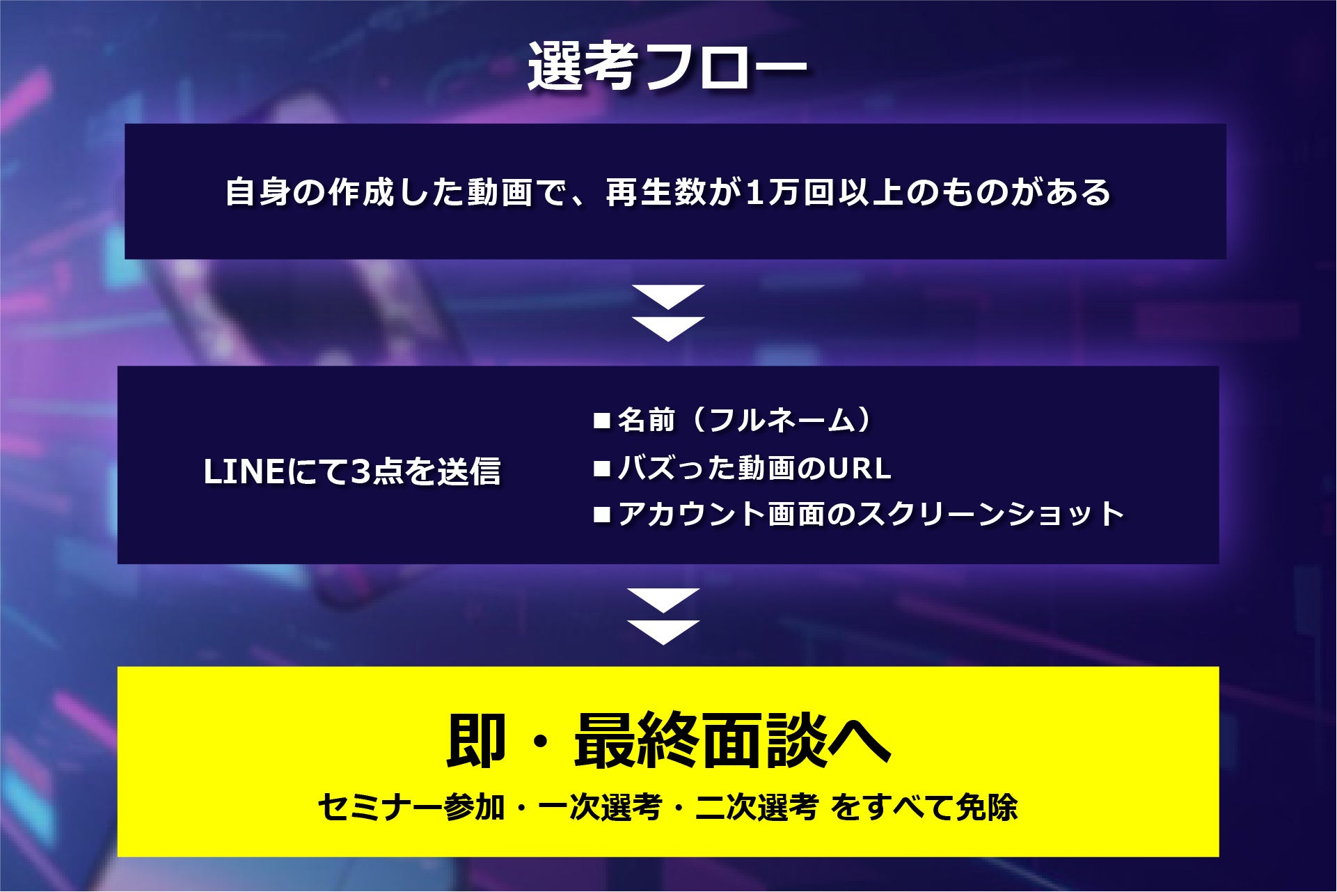 本採用では、従来の就職活動における常識を覆す選考フローを導入します 。 エントリーには、自身の制作した動画でバズったもの(再生数1万回以上)のリンクとアカウント管理画面のスクリーンショットをLINEで送信するだけです 。