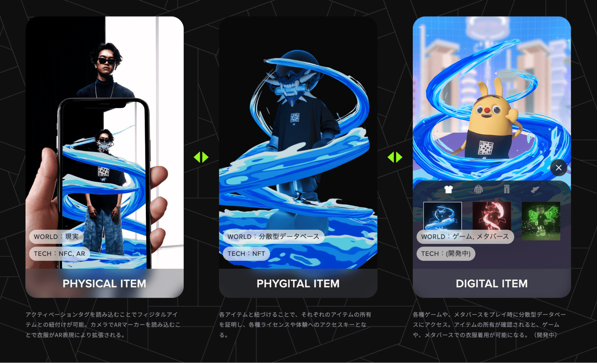 “フィジタル” とは、Physical(フィジカル)とDigital(デジタル)をかけ合わせた造語です。「XRT」とは、さまざまなIPやコンテンツの世界観を拡張するファッションにおける新規格。フィジカルなアイテムと、デジタルなアイテムを紐づけることで、それぞれの利用を可能にする「フィジタルアイテム」の所有を通じて、自己と他者・個々とコミュニティをつなぐ新たな手段を提供します。