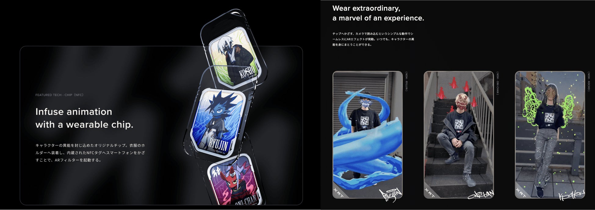 Tシャツ袖口のホルダーへ装着し、チップにスマートフォンをかざすことで、ARフィルターが起動します。チップを入れ替えることで、様々な自己表現や楽しみ方が可能になります。チップへかざす、カメラで読み込むというシンプルな動作でシームレスにARエフェクトが発動。いつでも、キャラクターの異能を身に纏うことが可能です。