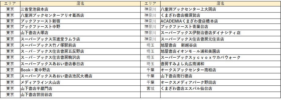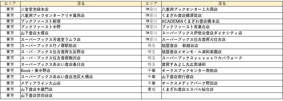 東京都・神奈川県・埼玉県・千葉県・宮城県の対象書店 ※詳細は書店一覧をご参照ください。