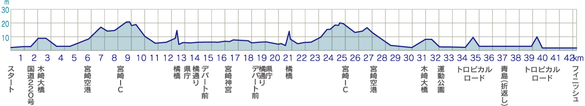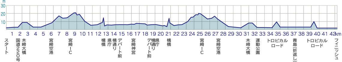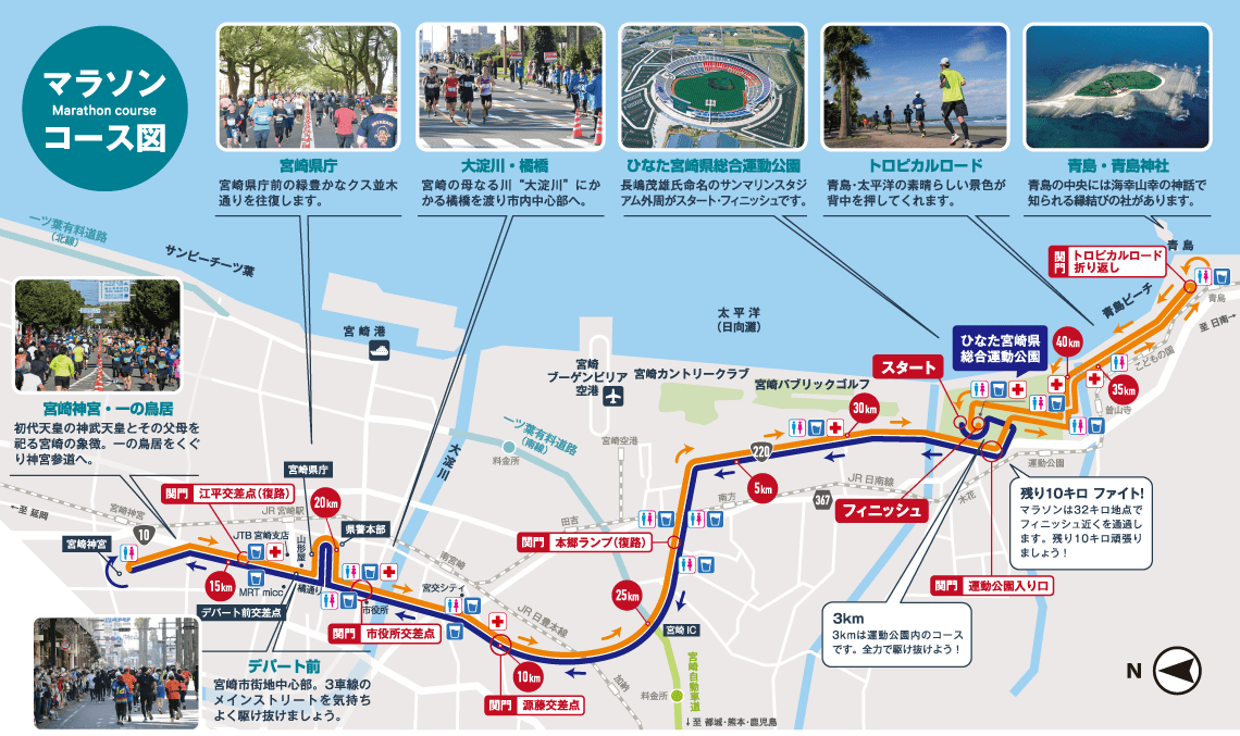 フルマラソン(42.195km)のコース前半は、宮崎市内中心部のメインストリートを全面的に使用。終盤は太平洋・青島の美しい景色を望むトロピカルロードが待ち受けます。