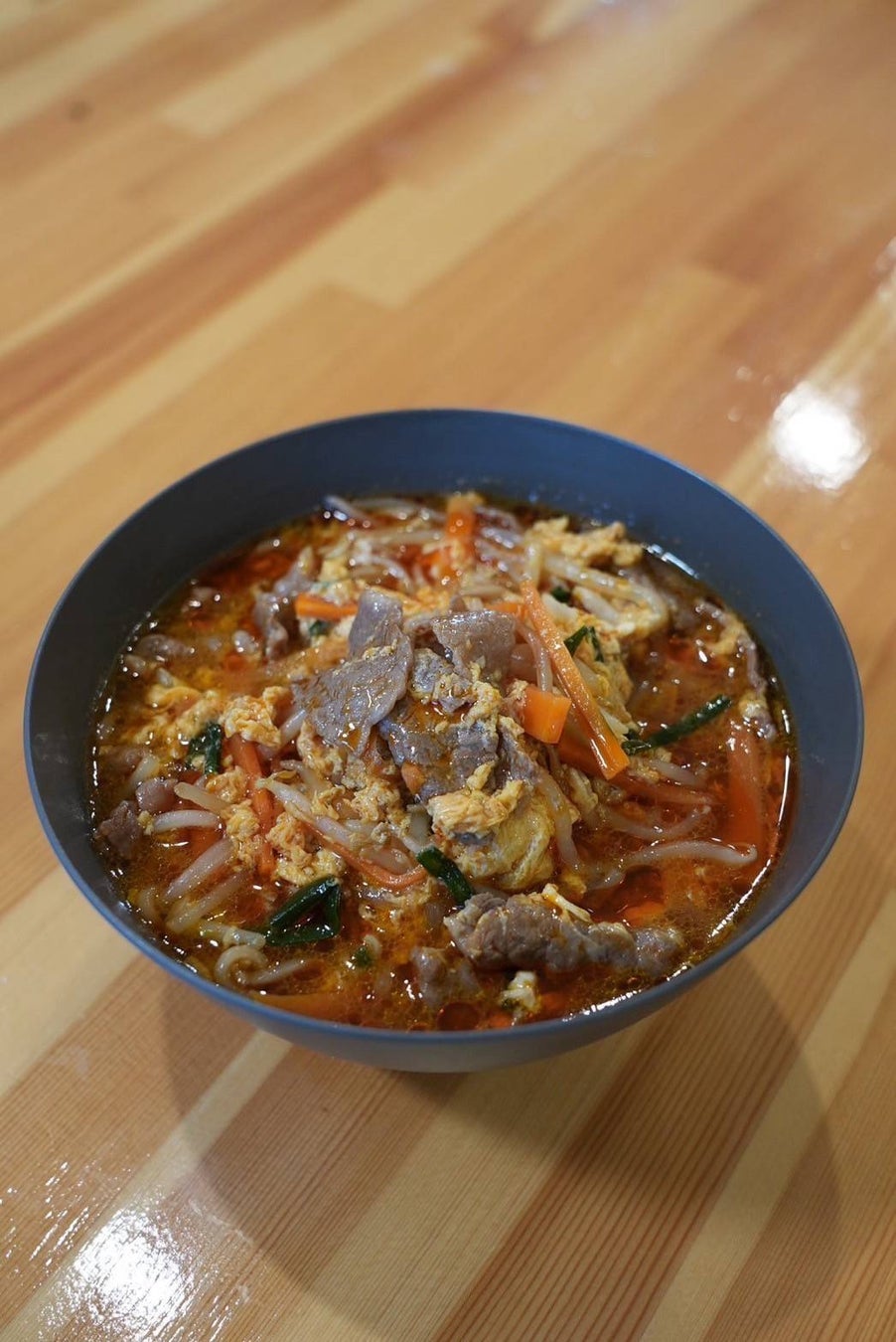 ①牛だしまたは鶏ガラスープを温め、コチュジャン・醤油・にんにく・ごま油・ラー油で味付けし、スープを作る。