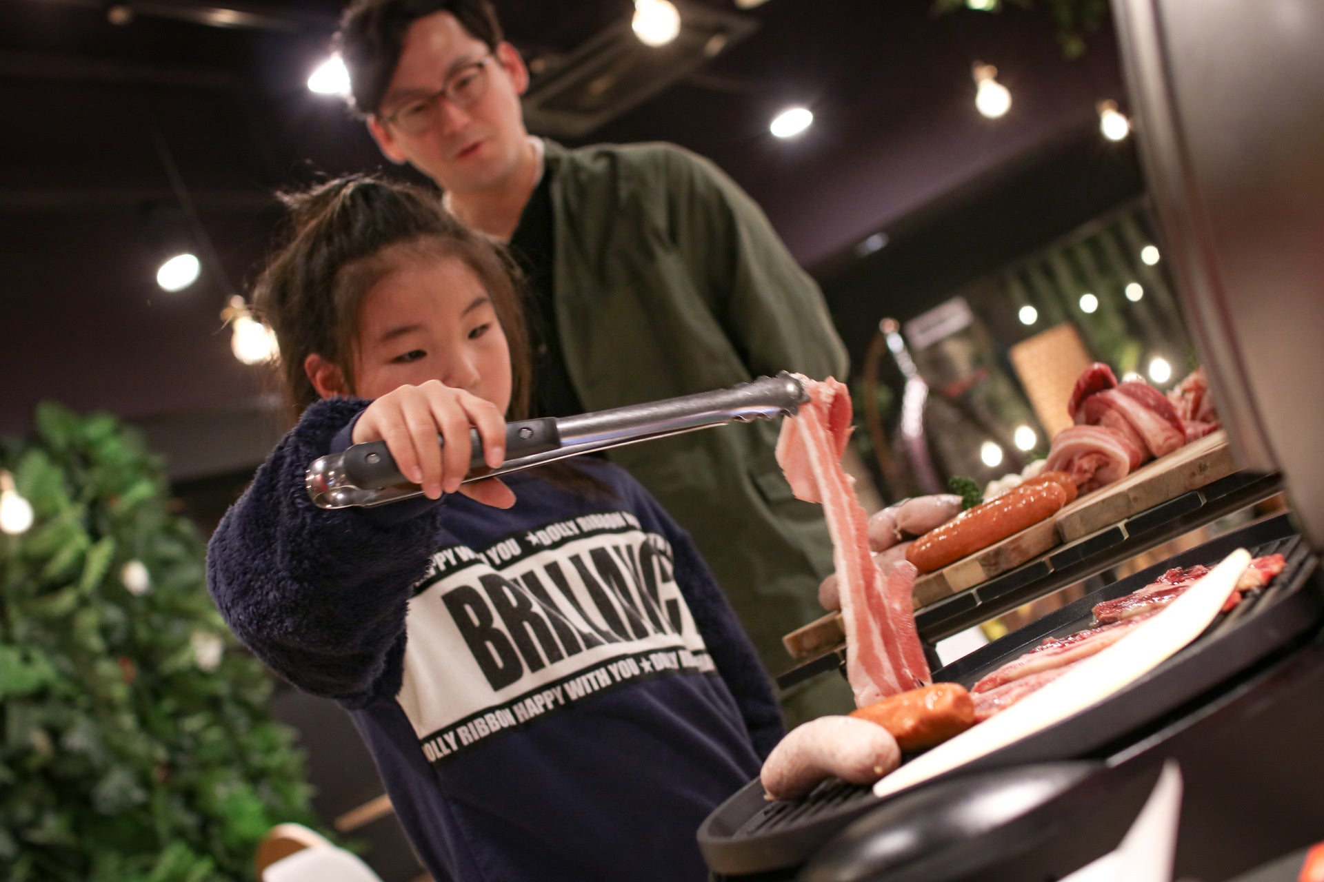 内装の壁にはスギの木をあしらっており自然の木の香りも漂う。本格アウトドアグッズで揃えられた椅子、テーブルやグリルで都会のど真ん中で「映える」BBQが楽しめます。