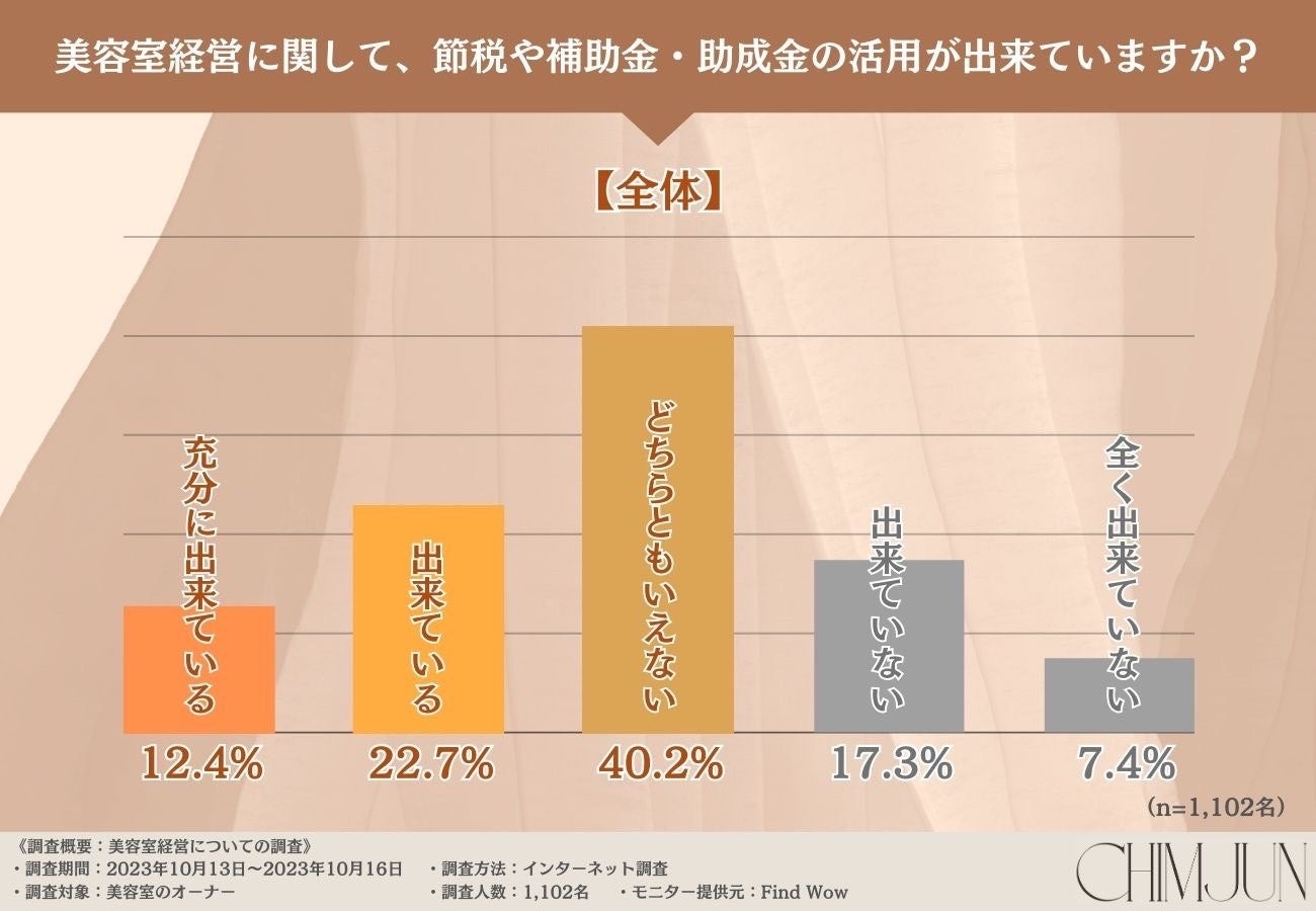 まず初めに、「美容室経営に関して、節税や補助金・助成金の活用が出来ていますか?」と質問したところ、『充分にできている(12.4%)』『出来ている(22.7%)』と出来ていると回答した方は、全体の約3人に1人しかいないという結果になりました。