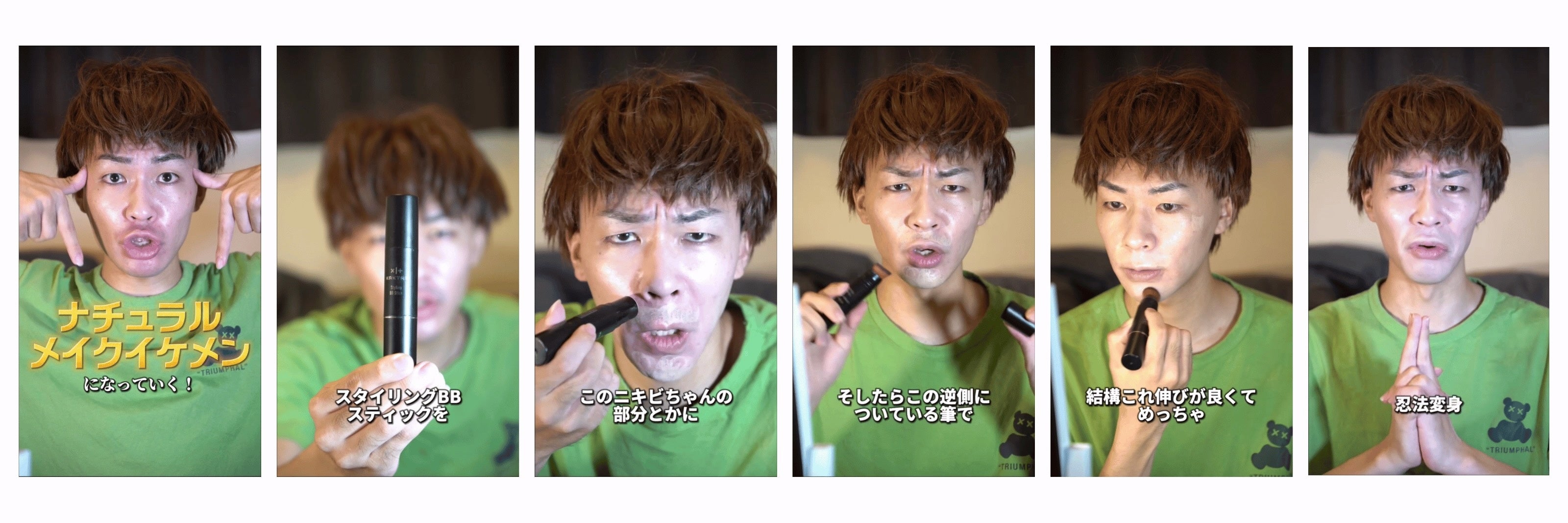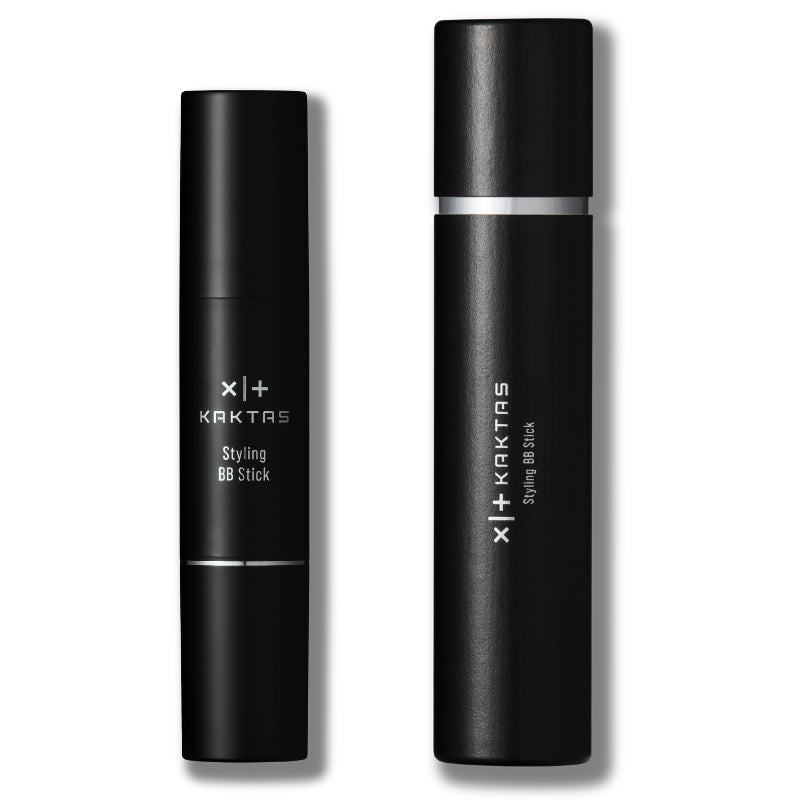 ナチュラルイケメン目指して使い方を紹介。まずはKAKTASのBBスティックで青髭やニキビなど肌悩みをカバーしていく。よく伸びるBBは反対側のふんわりブラシで優しくぼかしていく。そこからフルメイクへ変身。