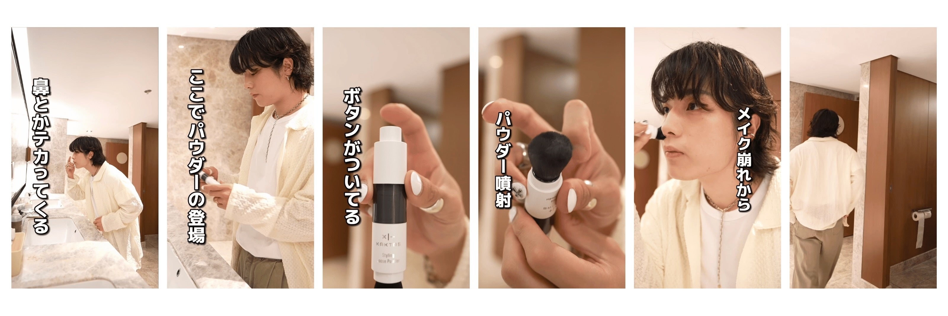 デートの最中、徐々にテカリ始めた顔。持ち歩いているパウダーで肌のテカリをサッと消していく。TOPのボタンを押すとブラシ内にパウダーが噴射。片手でサッと使って清潔感のある肌でデートに戻っていく。