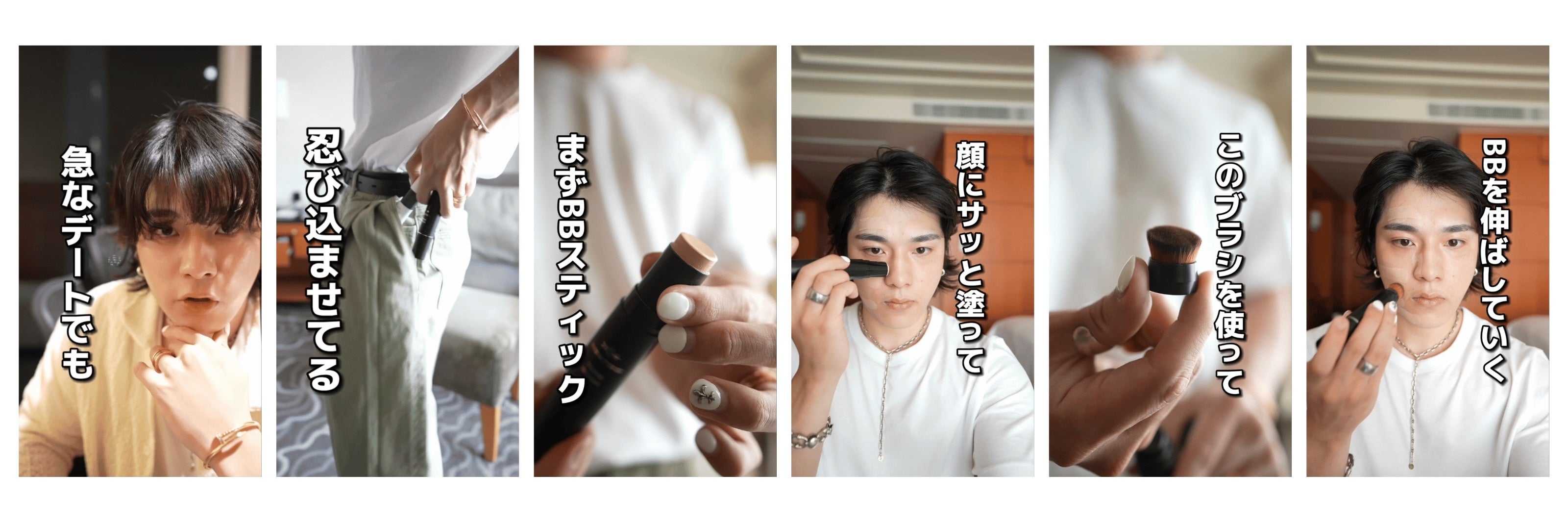 女性からの急なデートのお誘い。自信のある肌になるために、ポケットに忍び込ませたKAKTASを使っていく。BBスティックを肌にジュワッと伸ばして反対側のブラシで伸ばしていく。ブラシで伸ばすからテクニックいらず、肌にピタッと密着。青髭、毛穴等を隠す。