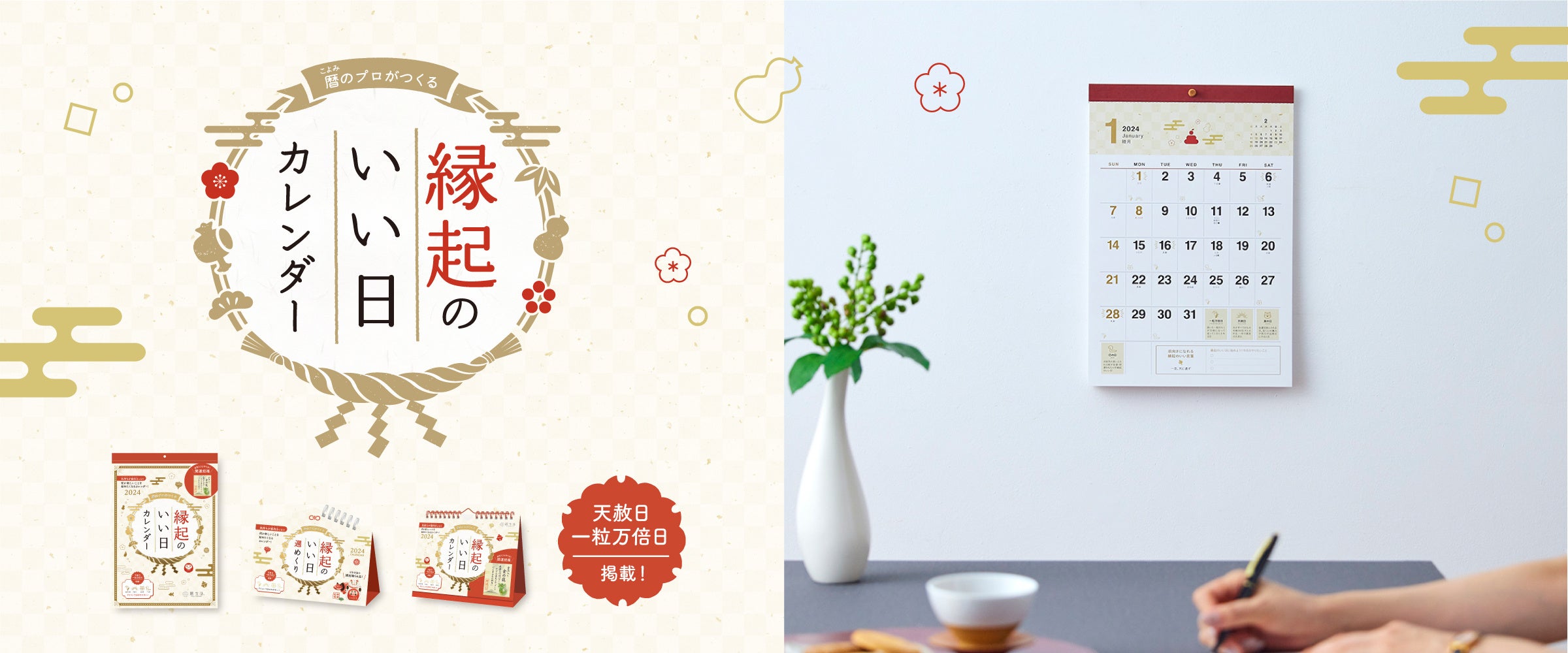 2022年より好評発売中の「縁起のいい日カレンダー」の壁掛けタイプ、卓上タイプと合わせて、3種のカレンダーシリーズとなりました。