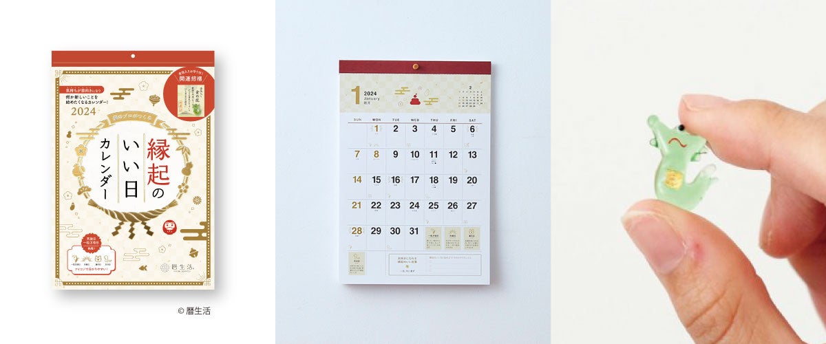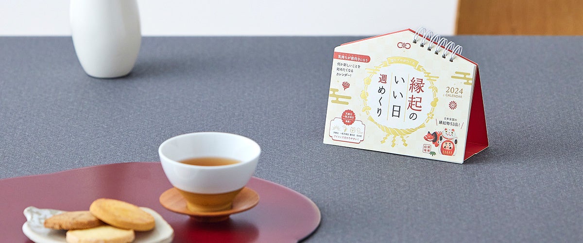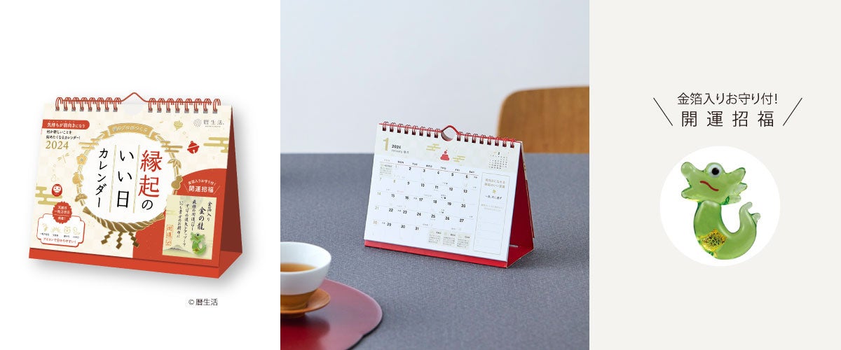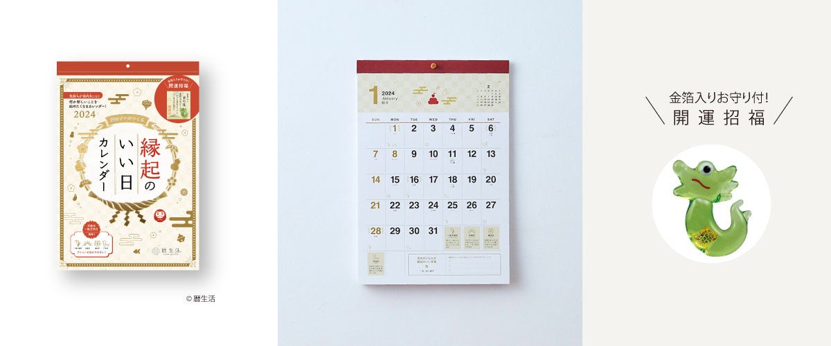 昨年発売して好評を博した「縁起のいい日 カレンダー」の壁掛けタイプと卓上タイプも、2024年版の販売を開始しています。今年は「開運招福」の龍のお守り付きです。※お守りは「縁起のいい日 週めくり」には付きません。