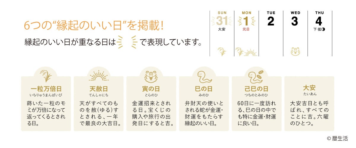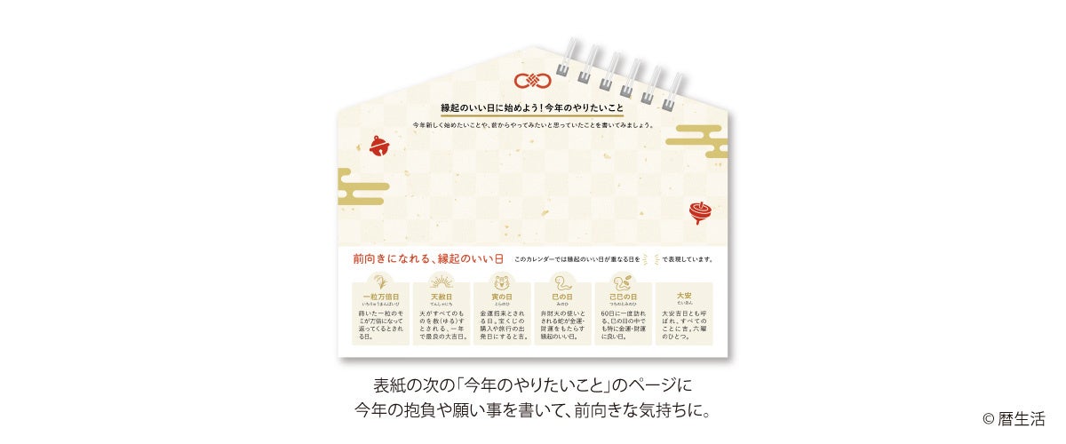新⽇本カレンダー(本社:⼤阪市東成区、代表取締役社⻑:宮﨑安弘)は、天赦日や一粒万倍日などの「縁起のいい日」の情報が満載の週めくりカレンダー「縁起のいい日 週めくり」を新発売しました。