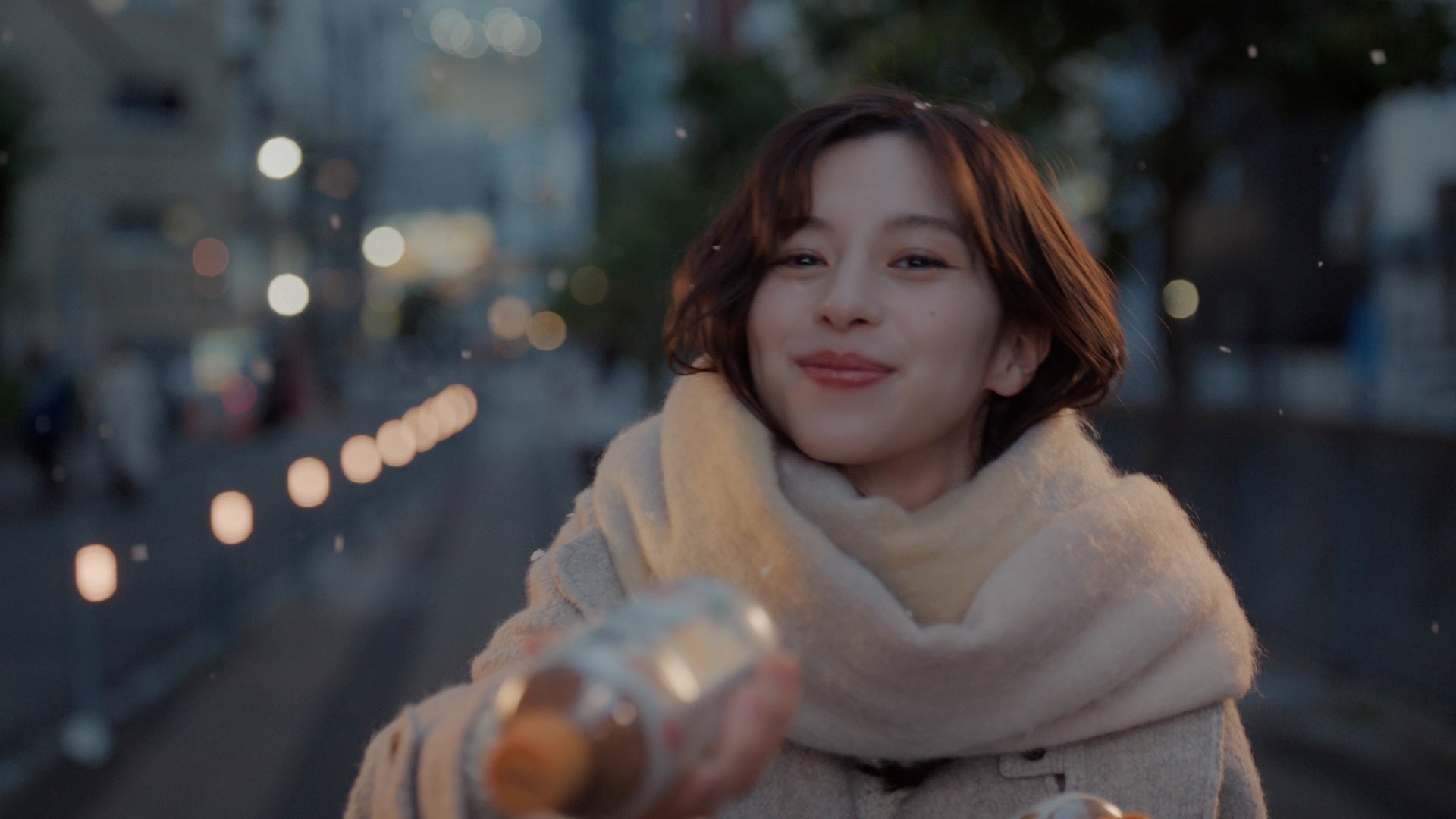 粉雪が舞う中「はいっ」と微笑みながらミルクティーを男性に手渡す中条さんの様子は、寒い時のミルクティーがほっこりと心を温める、どこか懐かしい気持ちを思い起こさせるようなシーンとなっています。