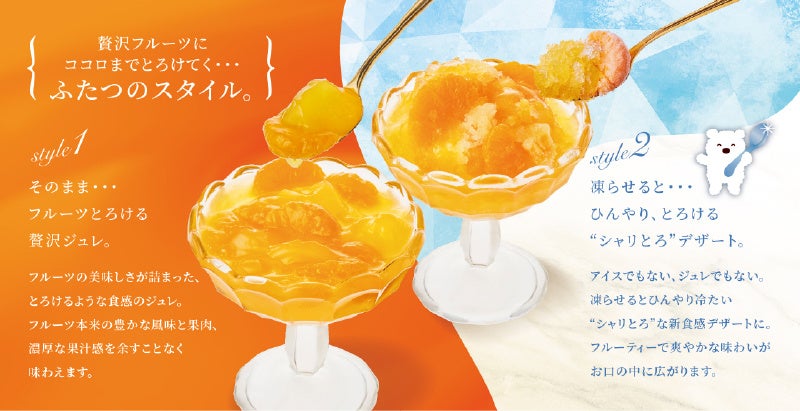 そのまま食べるとフルーツ果肉とジュレのとろけるご褒美デザート、凍らせるとひんやり冷たい“シャリとろ”な新食感デザートに。その日の気分に合わせて、好みの食べ頃でお楽しみいただけます。