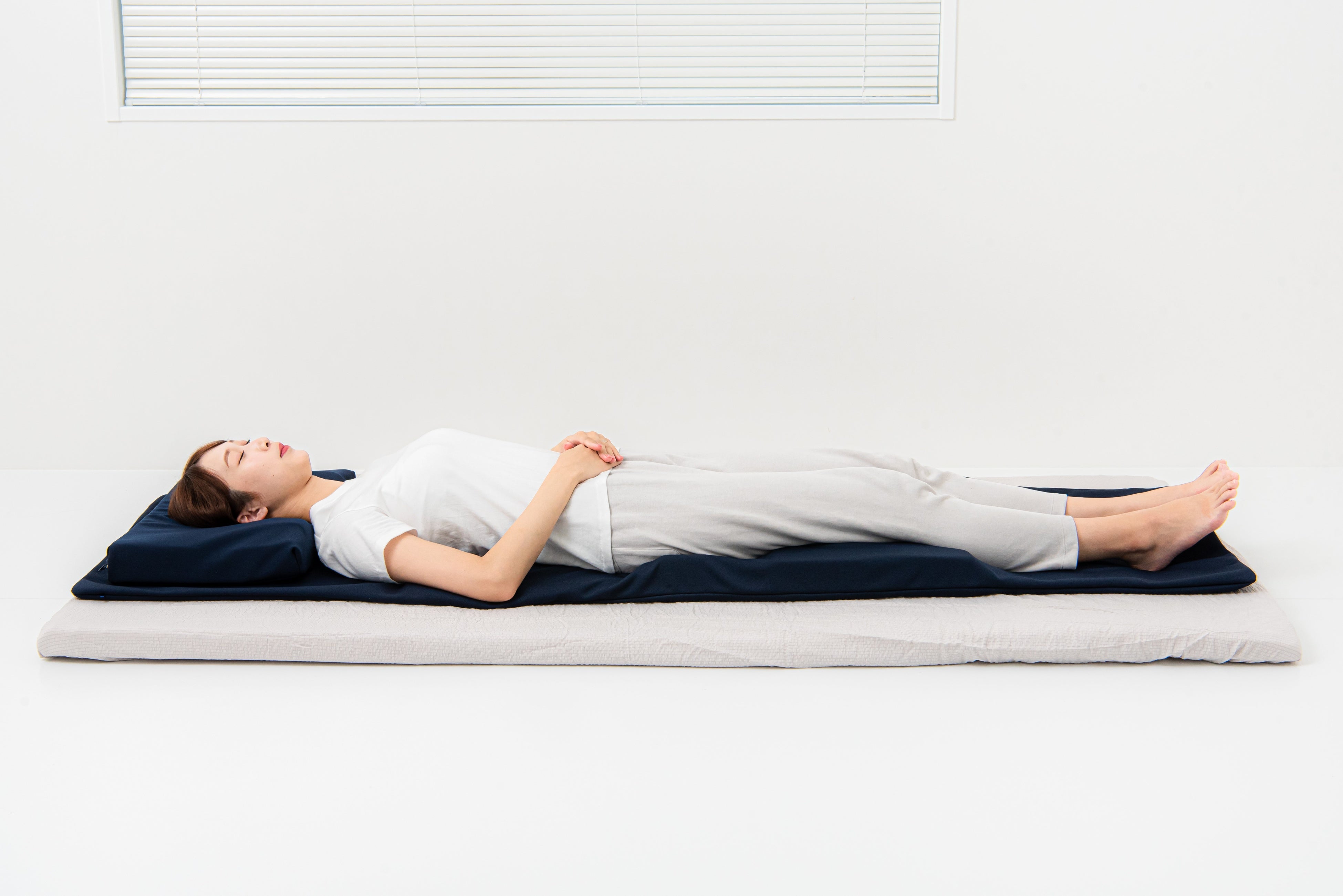 一般的な平面マットレスでは、仰向け時に仙骨と臀部に荷重が集中し、仙骨の動きが制限されやすく、胸郭や体幹の動きが小さくなることで呼吸が浅くなりやすい姿勢になります。