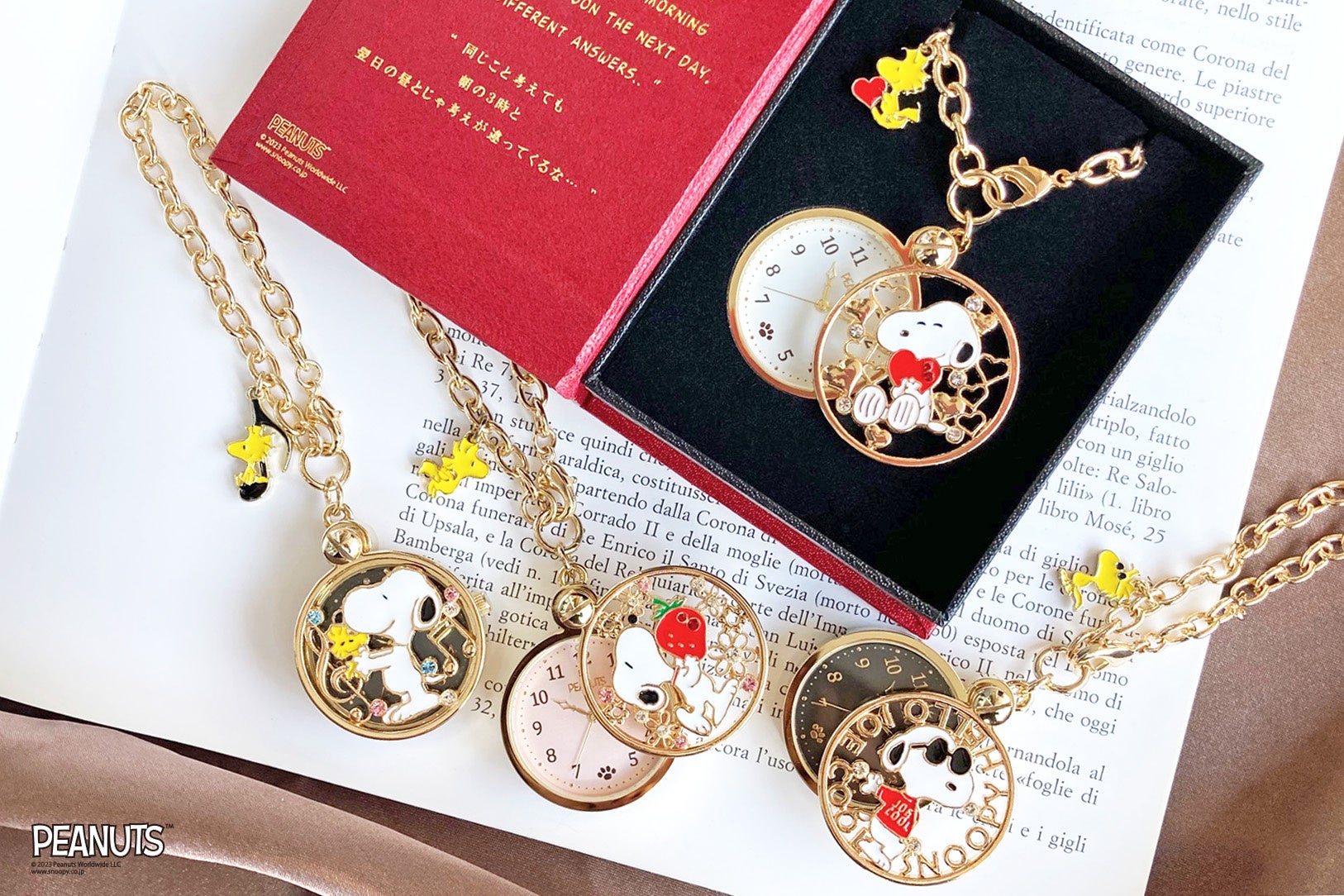 キュートなウッドストックのチャーム付きで、スヌーピーファンに大人気のハートを持ったスヌーピーやジョークールをあしらった4種類展開です。