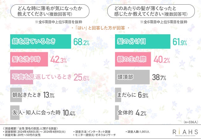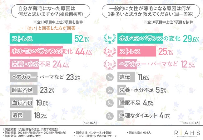 そこで今回、女性のための薄毛治療を行っているリアスクリニック(https://riahsclinic.com/)は、20代から50代の女性を対象に「女性の薄毛の原因」に関するアンケート調査を実施しました。