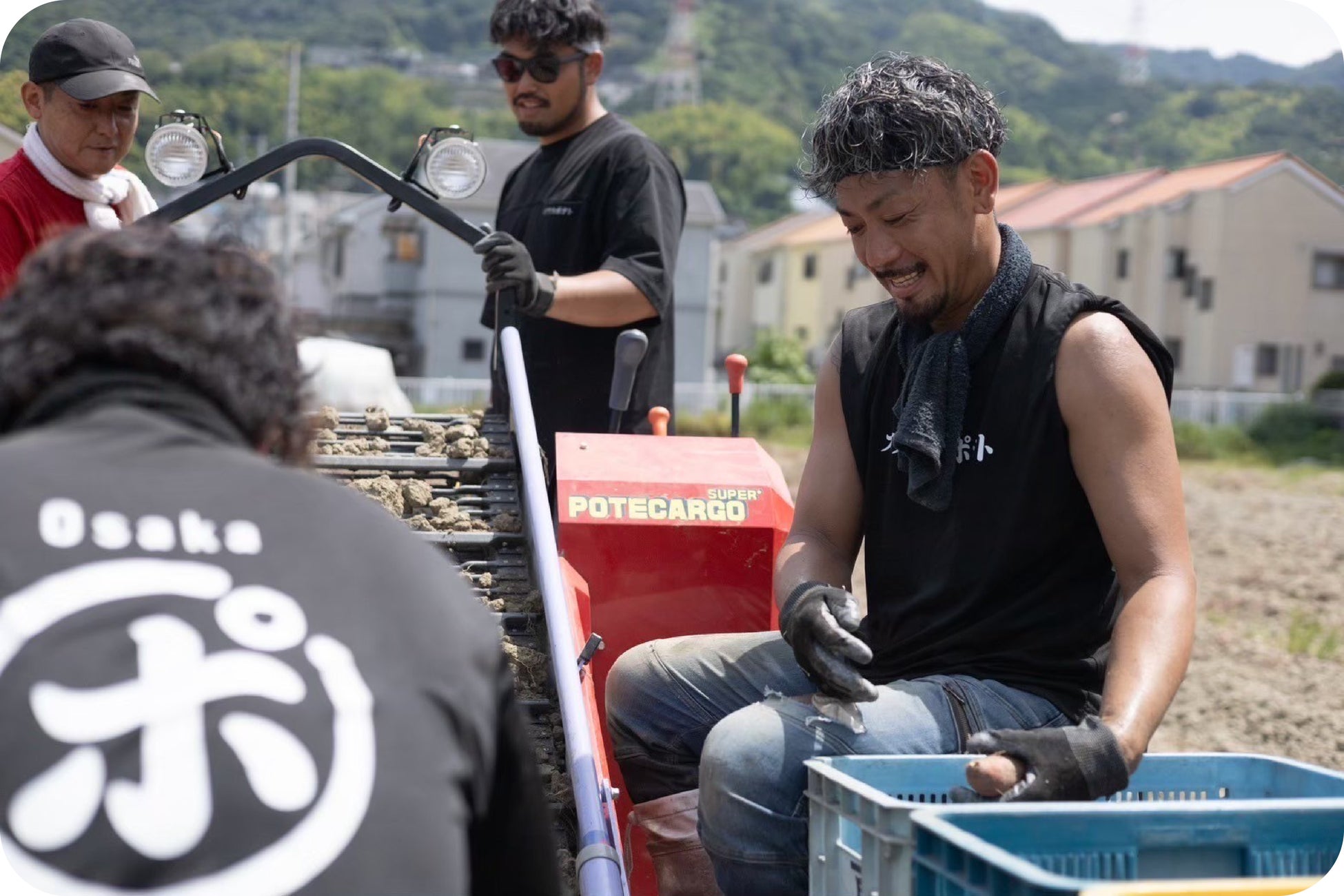 オオサカポテトは、全員が農業新規参入メンバーです。活動に共感できる想いある仲間で集まり、規模拡大に合わせ脱サラ専業農家が一人づつ増えていっています。撮影に参加できなかったものの、当活動に注力しているメンバーがまだまだたくさんいます。