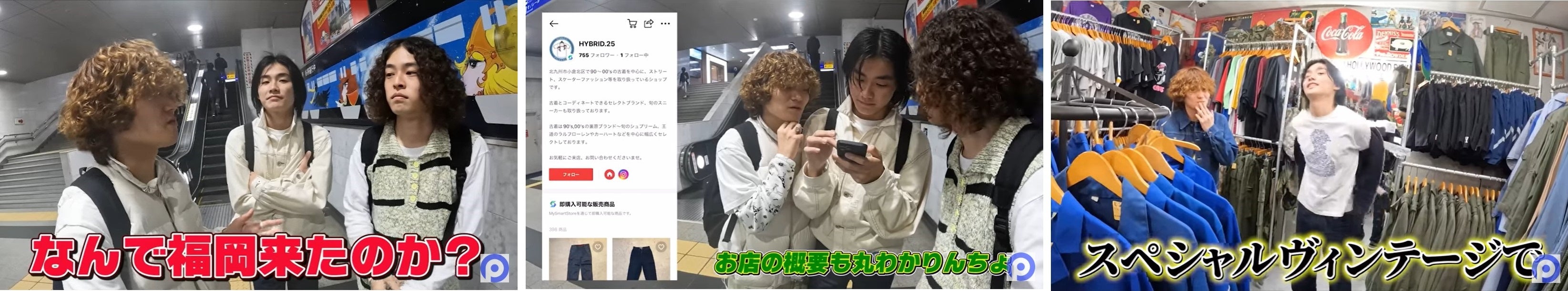 「福岡の古着屋にも来て!」とリクエストが多かったポーカーズの3名。Vintage.Cityの「ショップ検索機能」を使い、たくさんの古着屋の中からテイストの違う2つの古着屋の情報を事前にリサーチします。今回訪問する古着屋は北九州小倉にある90〜00'sの古着を中心に、ストリート、スケーターファッション等を取り扱っている「HYBRID.25(ハイブリッド ニジュウゴ)」、ミリタリー系のヴィンテージアイテムが豊富な久留米にある「i-D(アイディ)」。ジャンルの異なる古着屋で3名が選んだプレゼントアイテムも動画内で紹介します。