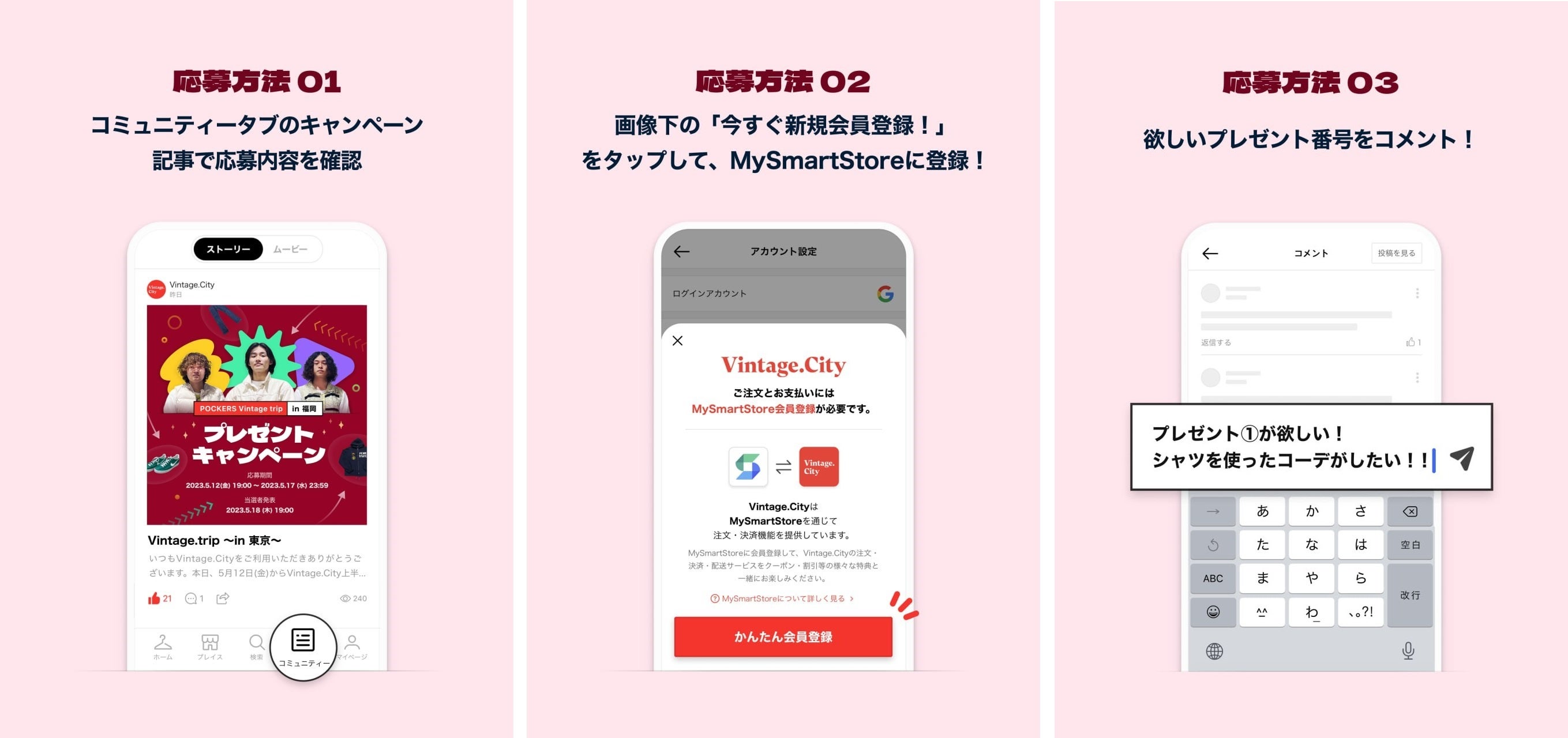 STEP1.ヴィンテージ・ファッション・アプリ「Vintage.City(ヴィンテージ・シティ)」内の「コミュニティ」ページに公開される「キャンペーン記事」で応募内容を確認。