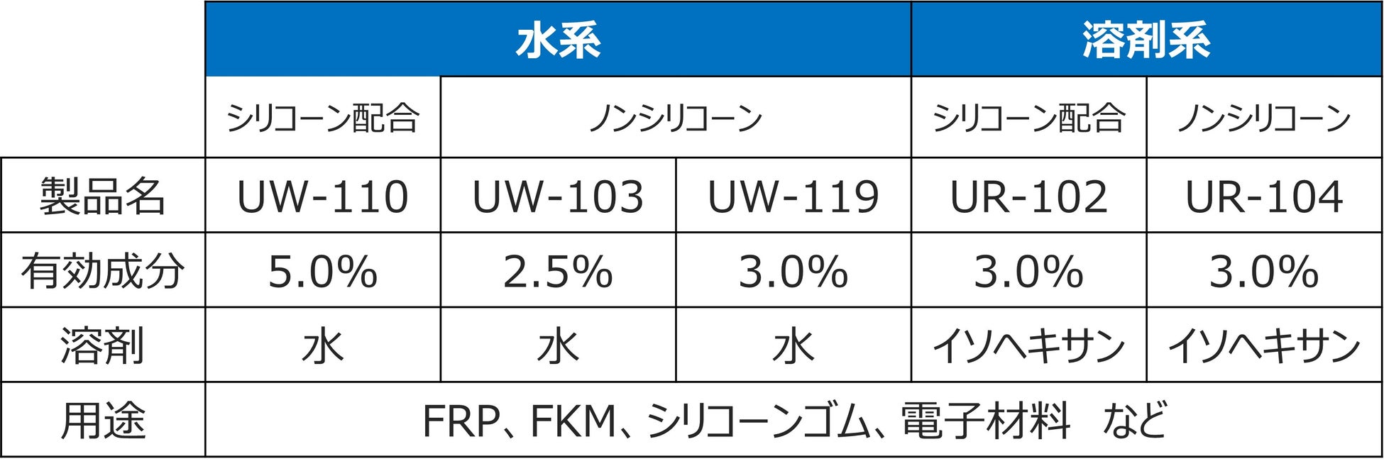 成型品の材質に合わせて、シリコーン含有タイプとノンシリコーンタイプの2種類からお選びいただけます。