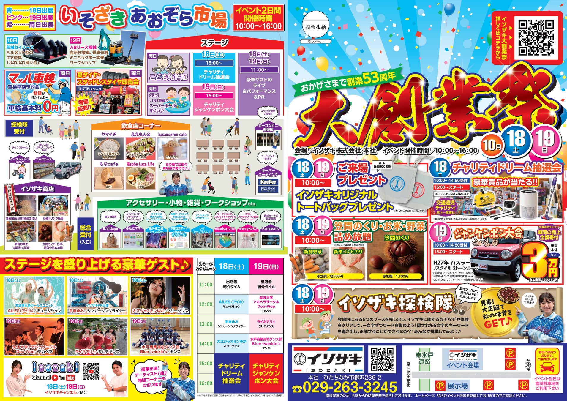 茨城県ひたちなか市を拠点に自動車販売・整備を手がける イソザキ株式会社(本社:茨城県ひたちなか市、代表取締役:磯﨑拓紀)は、お客様そして地域の皆さまへの感謝を込めた年に一度の恒例イベント 「イソザキ大創業祭2025」 を、2025 年10 月18 日(土)・19 日(日)の2 日間、本社敷地内で開催します。