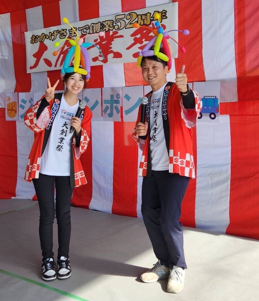 特設ステージでは、アーティストのライブ演奏、大学のアカペラサークル、地元高校のダンスチームなど、多彩なパフォーマーが登場。元気あふれる演目で会場を盛り上げます。また、イソザキチャンネルMC による進行で行われる「ドリーム抽選会」では、家電やギフト券などの豪華景品が当たるチャンス!さらに、毎年大盛況の「じゃんけん大会」も開催決定!勝ち抜いた方には、なんと「3 万円カー」(H27年ハスラーJスタイル2トーンルーフ)を購入できます!会場全体が一体となって盛り上がる、創業祭ならではの目玉企画です。