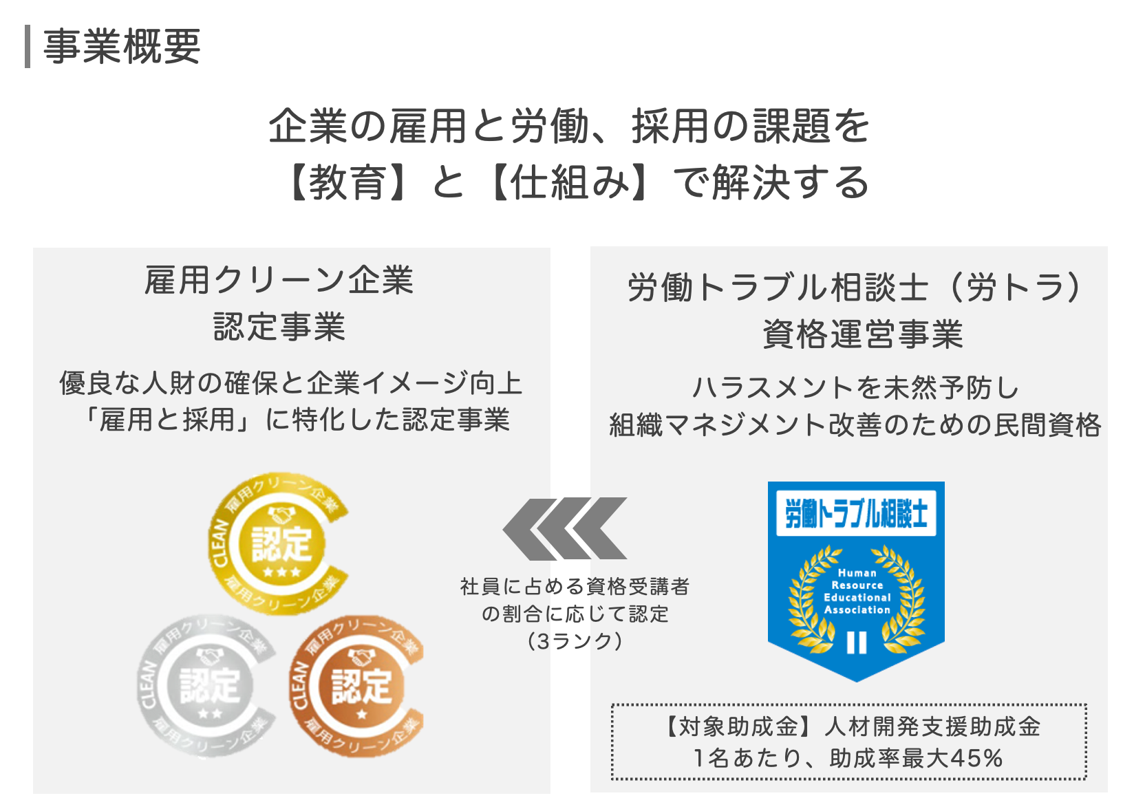 SAグループでは、今回自社の組織マネジメントでの成功体験をもとに、「社会の働き方を変える」という大ミッションに挑みます。この度、一般社団法人を設立し、企業の雇用と労働、採用の課題を【教育】と【仕組み】で解決します。具体的には、①『雇用クリーン企業認定事業』では優良な人財確保と企業イメージ向上による採用強化。②『労働トラブル相談士事業』では職場でのハラスメントや労働トラブルの予防による組織マネジメント改善での生産性向上を図ります。