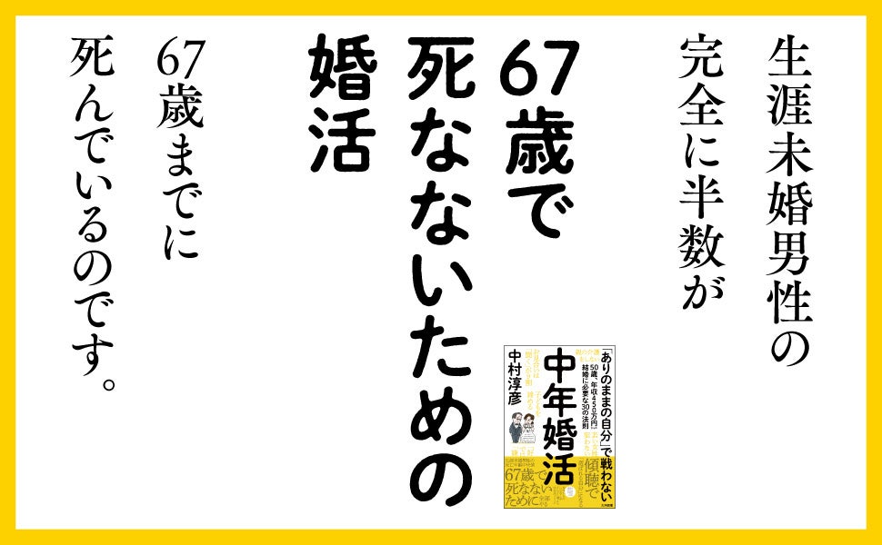 生涯未婚の男性は早死にする…⁉︎衝撃の死亡中央値・67歳で死なないために、中年男性はいますぐ婚活を。累計120万部著者が放つアラフィフ男性のための傾聴婚活マニュアル発売!