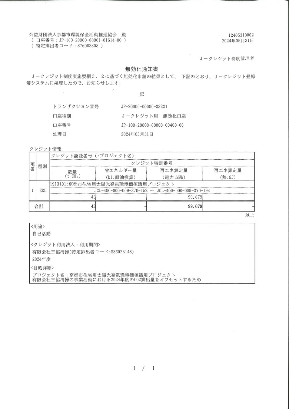 そして2024年5月31日、ようやくそのクレジットの無効化処理が完了したことにより、当社と当社グループ各社が京都市内で廃棄物の収集業務を行う際の二酸化炭素排出量との相殺に活用させて頂く事が出来ましたので、ここにご報告申し上げます。