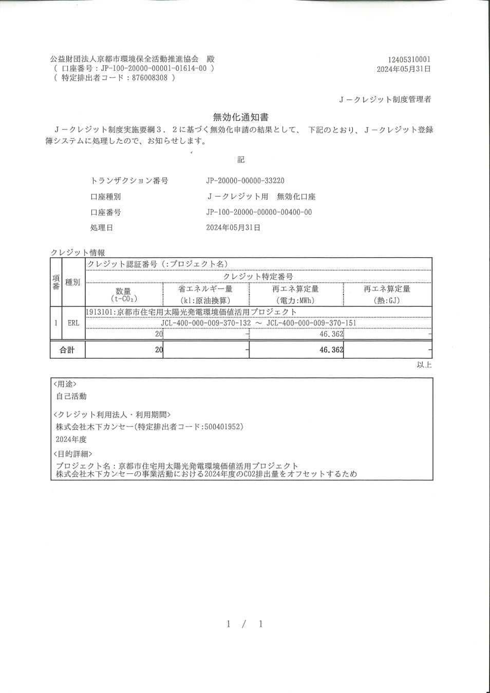 今回、この取り組みに当社も賛同し、応援する気持ちも込めて、参加されておられる京都市内の一般家庭の皆様により創出された「京都再エネクラブJ-クレジット」の内、63トン分を2024年2月に購入させて頂きました。