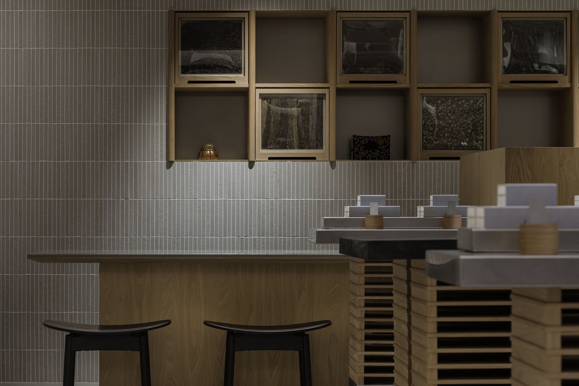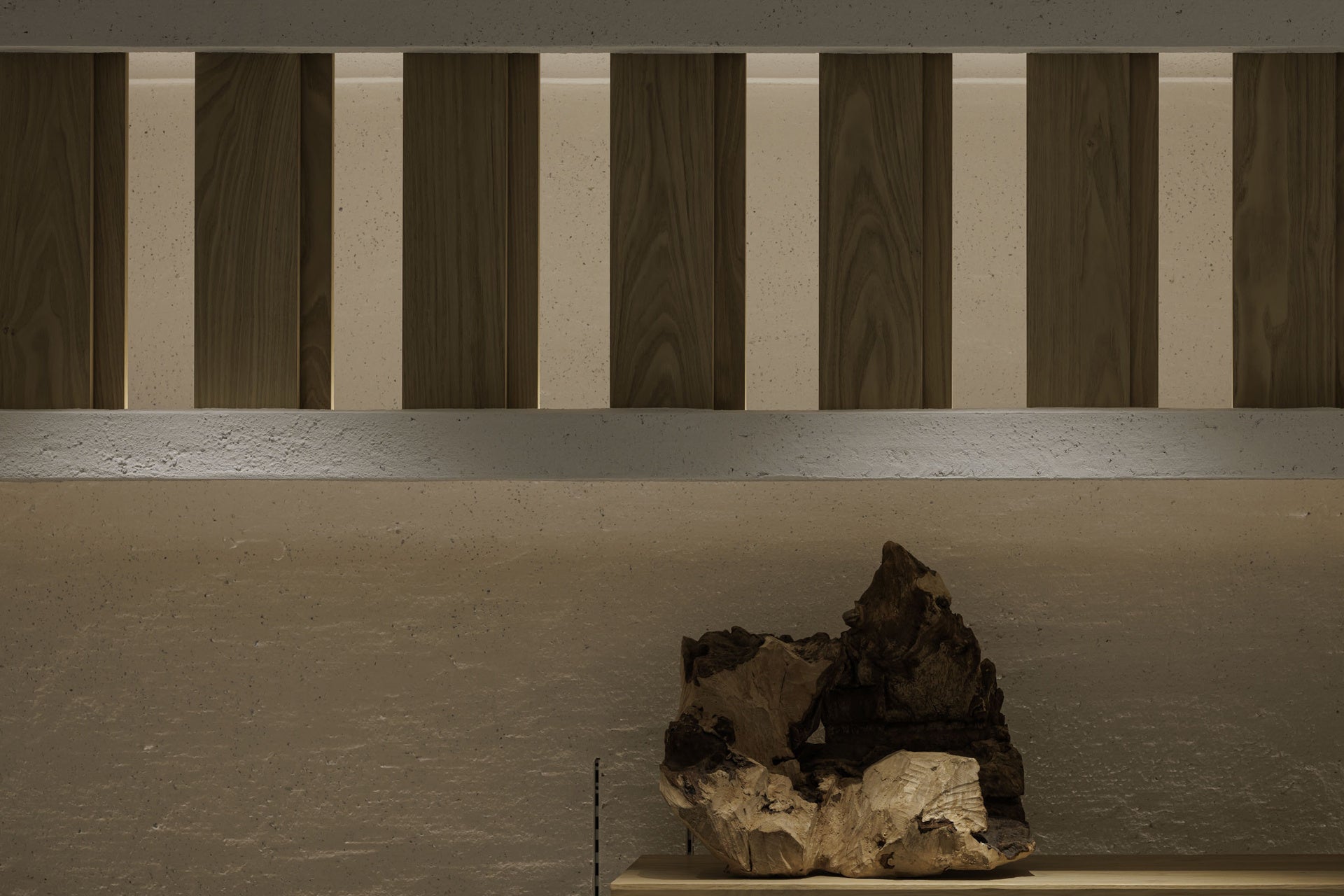 昔ながらの線香工場には「べかこ」というスライド式の連子窓があり、窓の開き具合を職人が調整することでお線香を乾燥させていました。この「べかこ」をヒントに、壁面上部の照明をデザイン。板をスライドさせることで、明かりに変化をもたらす役目をもたせています。