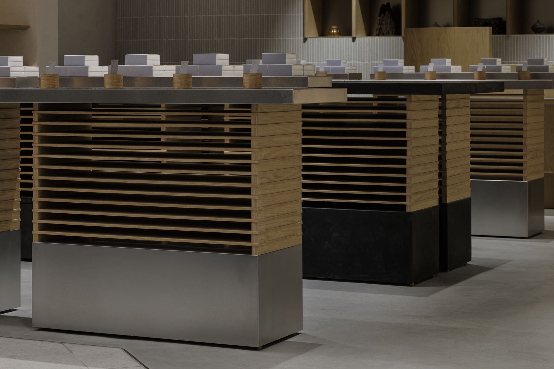 お香を乾燥させる際に用いる「干し板」から発想した可動式の什器。天板の左官の黒が伝統を、ステンレスのシルバーが現代を表現。