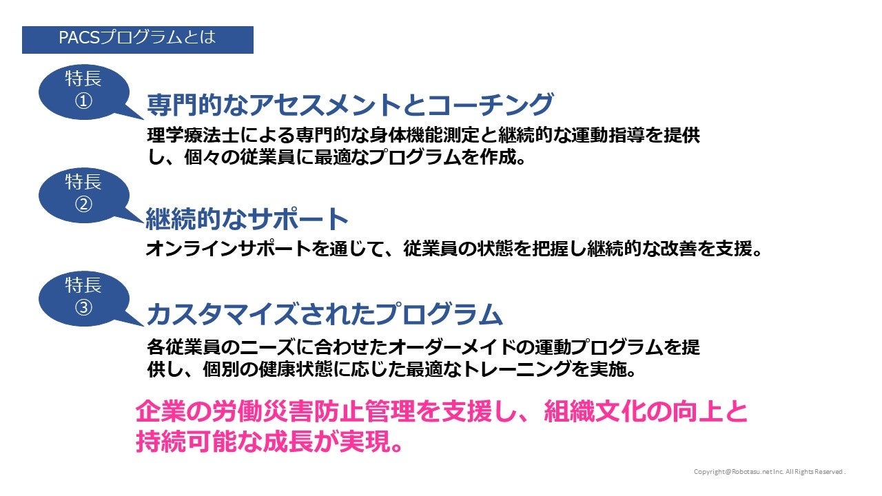 ロボタスネット株式会社は、『腰痛予防の窓口』を通じて、職場の安全対策を強化し、従業員の健康管理をサポートするための様々なサービスを提供しています。