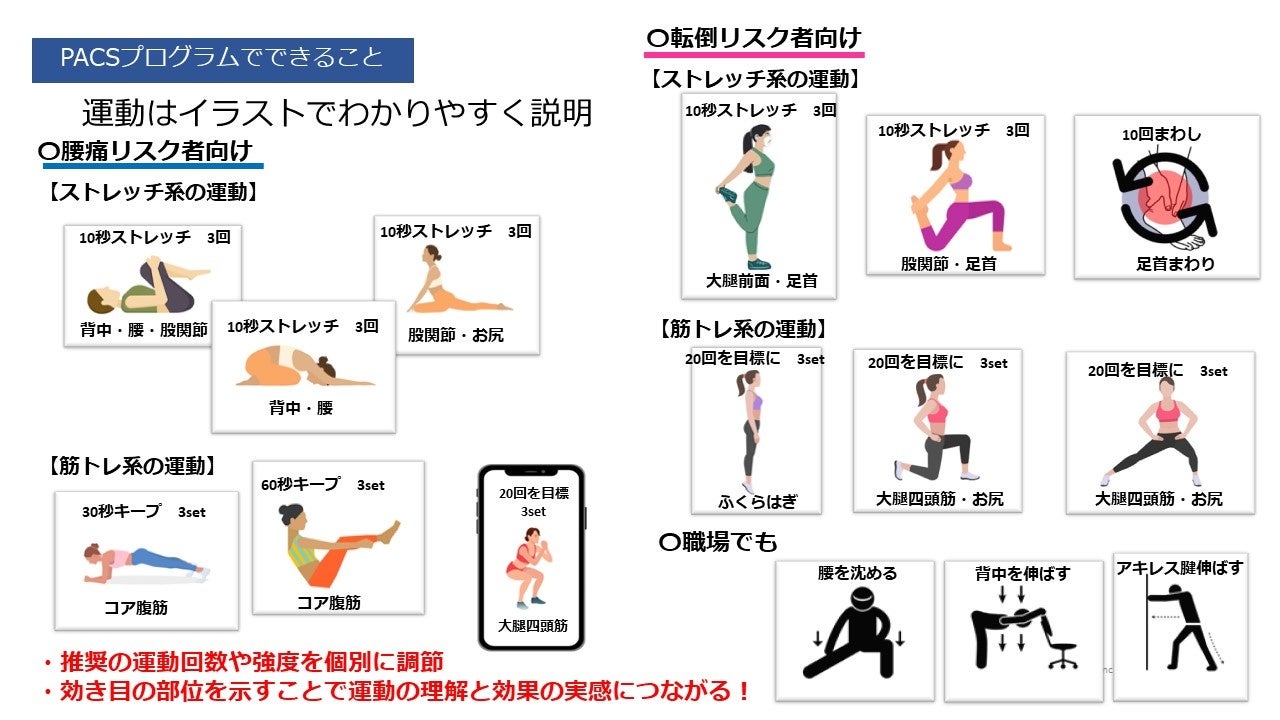 その一環として、PACSプログラム(Physical Assessment and Coaching for Safety)を導入し、理学療法士による個別のフィジカルチェックと適切な運動プログラムの提案を行っています。