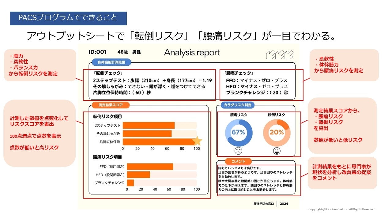 専門家が個別に適切な運動プログラムを提案し、従業員の健康管理をサポートします。リスク評価のデータを個別シートとして提供し、職場全体の状態やリスクを把握できるようにします。