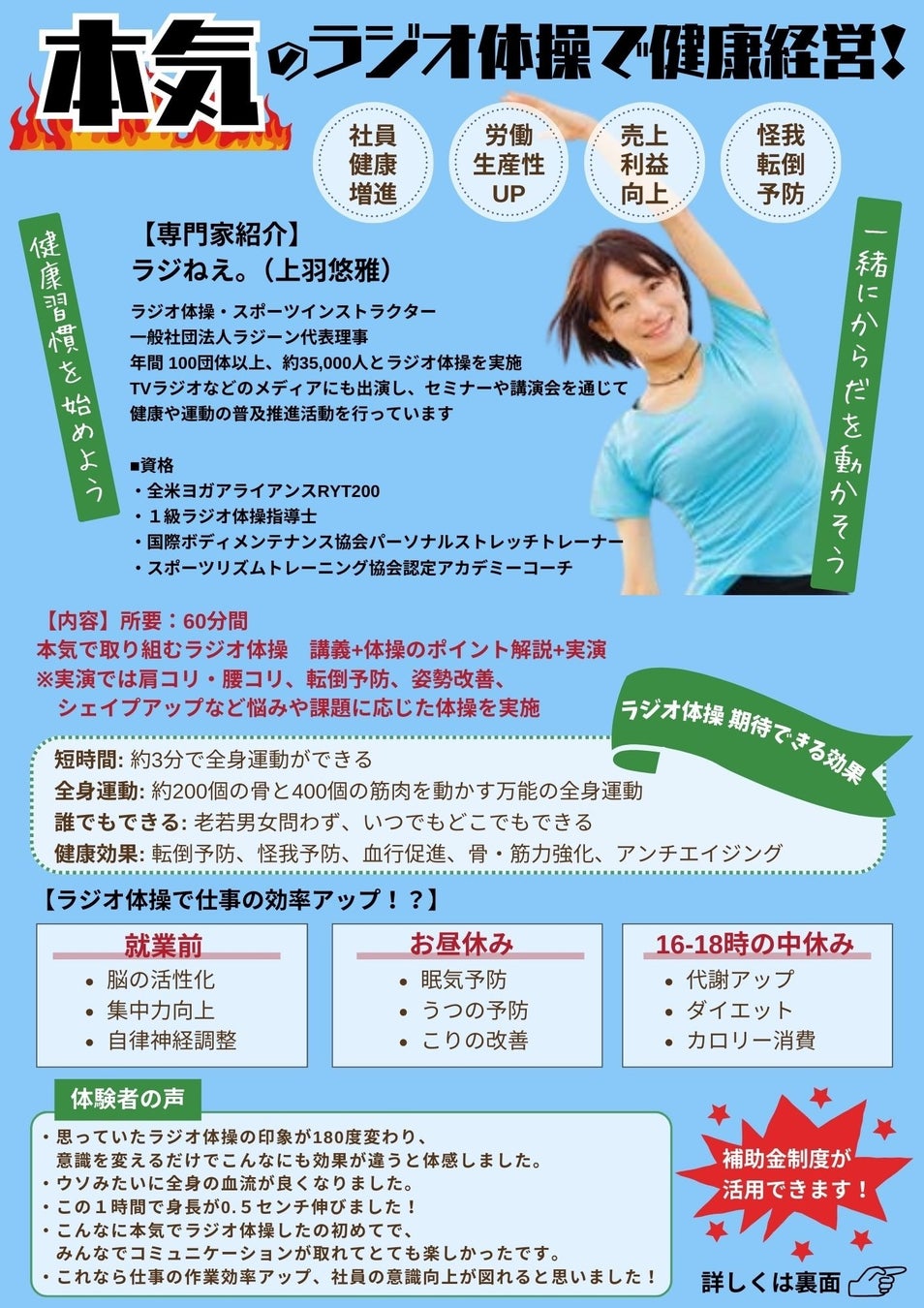 職場の健康管理に!「本気のラジオ体操&フィジカルチェック付運動指導」エイジフレンドリー補助金を活用したプログラムがスタート