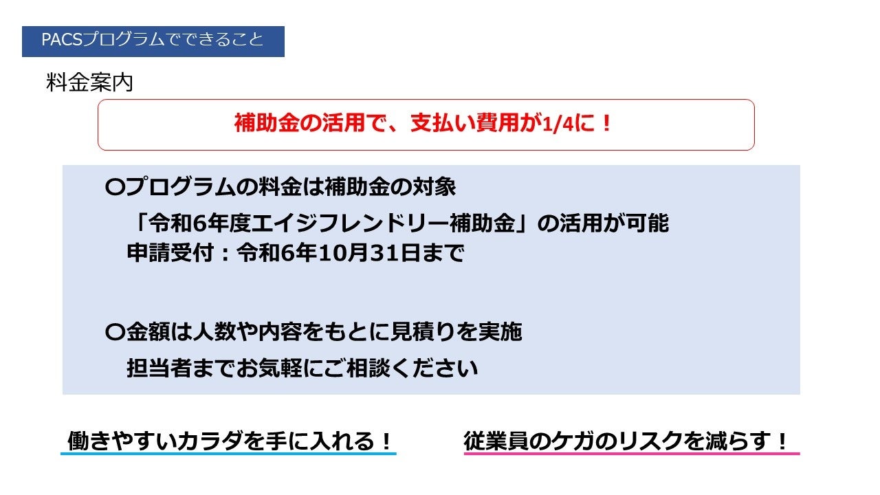 エイジフレンドリー補助金を利用することで、費用負担を軽減しながらプログラムを実施することができます。詳細については、お問い合わせください。