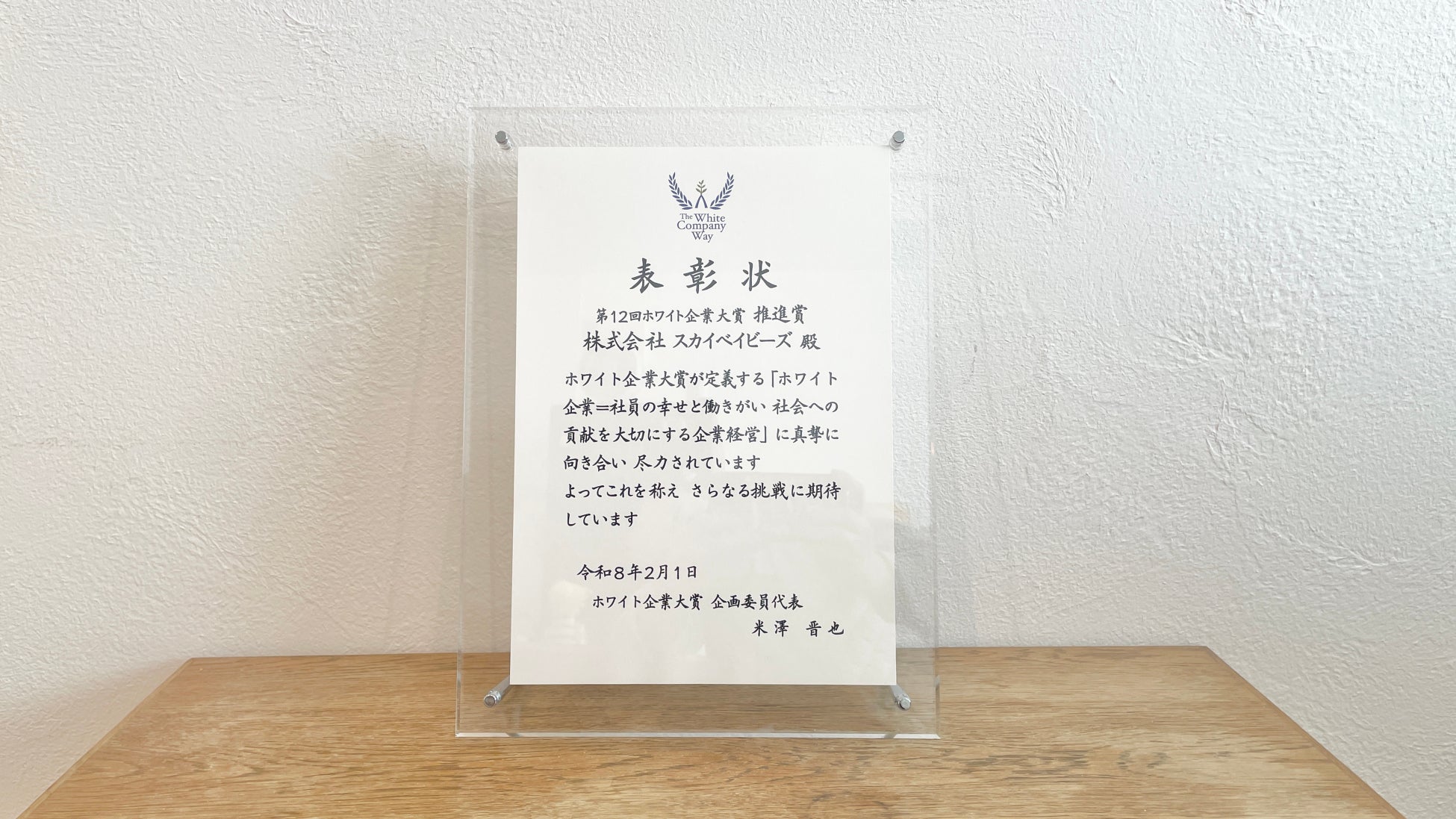 株式会社スカイベイビーズ(本社:東京都新宿区、代表取締役:安井 省人)は、一般社団法人ホワイト企業大賞企画委員会が主催する「第12回ホワイト企業大賞」において、「推進賞」を受賞したことをお知らせいたします。