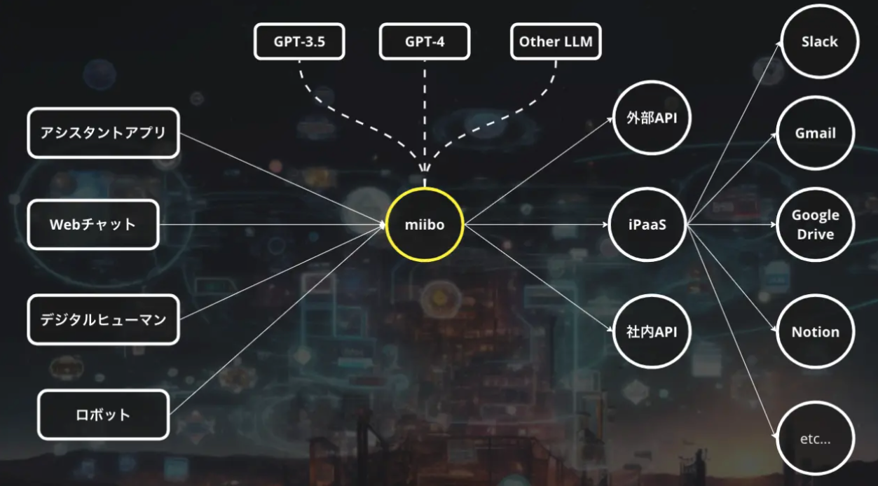 株式会社miiboは、会話型AIがもたらす革命を「人間がAI技術を"自然な会話"で扱えるようになった」ことだと捉えています。私たちは、さまざまな技術を会話型AIを介して繋げる「Connect Everything」構想を進めており、「miibo」を通じて、会話型AIを各種サービスと手軽に連携できる状態を目指しています。既に、外部APIや社内API、ZapierなどのiPaaSと組み合わせることで、様々なシステムと連携した会話型AIを構築することが可能です。