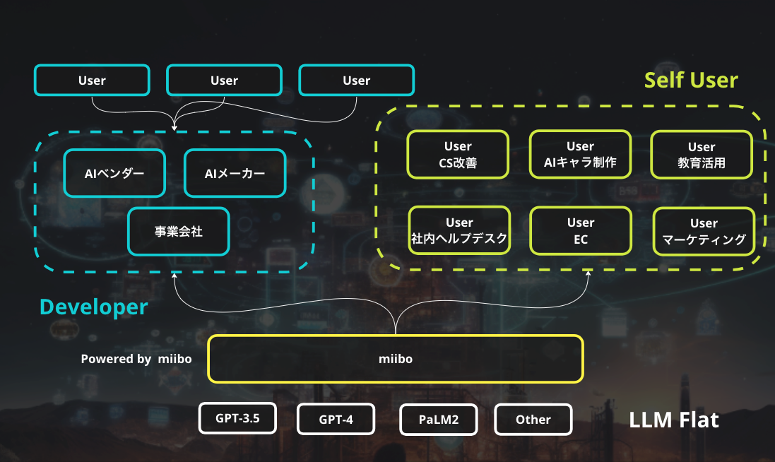 miiboは、スピーディにAIを作りたいSelf Userにとっては「手軽なAI開発サービス」であり、開発効率を上げたいDeveloperにとっては、「痒いところに手が届く汎用的な会話型AI構築プラットフォーム」です。