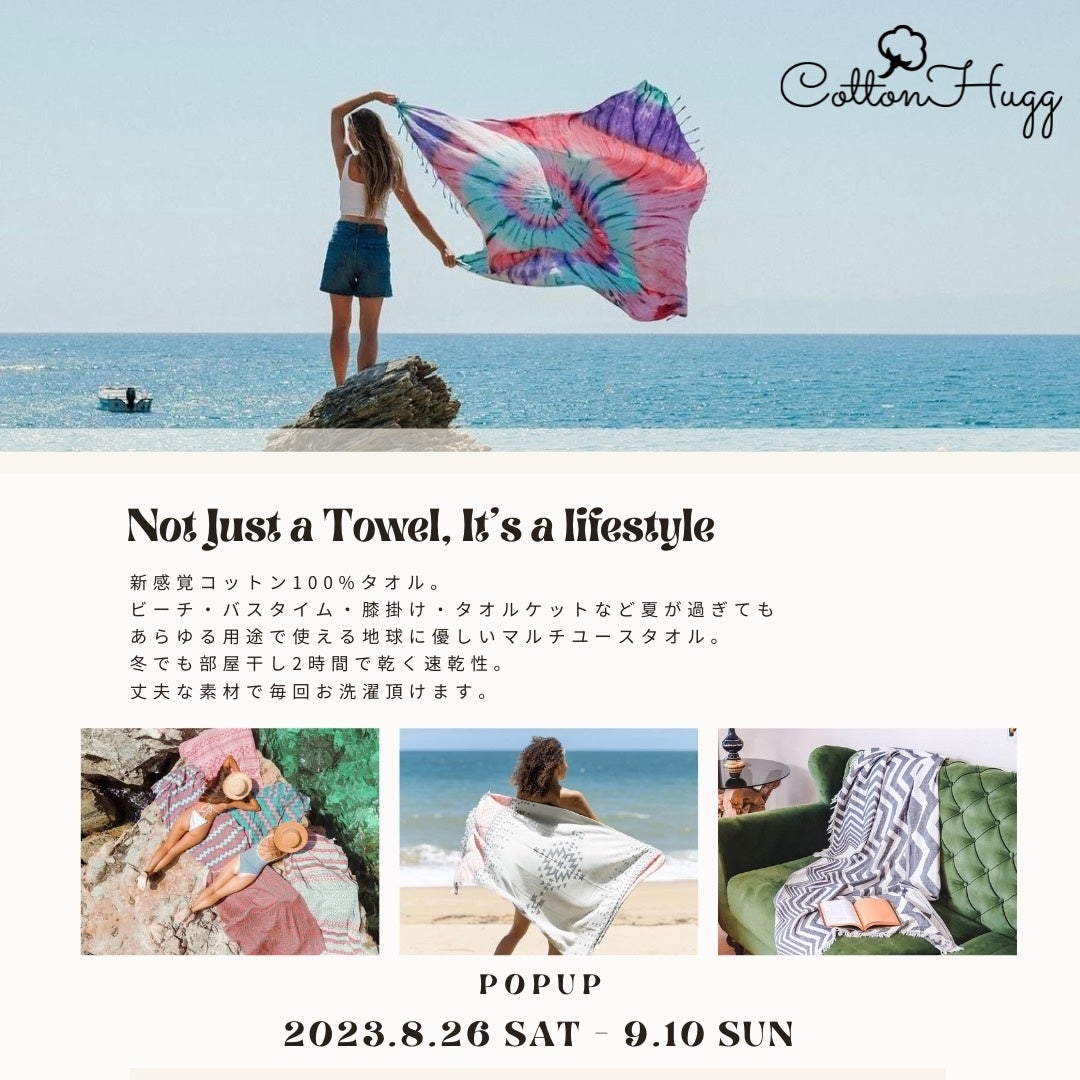 通常は、オンラインで展開の『CottonHugg(コットンハグ)』が期間限定でPOPUP STOREを開催。是非この機会にCottonHuggのマルチユースなコットンタオルを手に取ってお試しください!