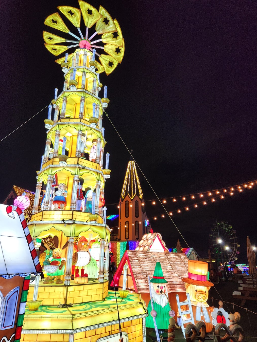 会場は、サンタクロースやトナカイ、ドイツの煙出し人形をモチーフにしたランタンで華やかに装飾され、中でもひときわ目を引くのは、クリスマスマーケットのシンボル「クリスマスピラミッド」。