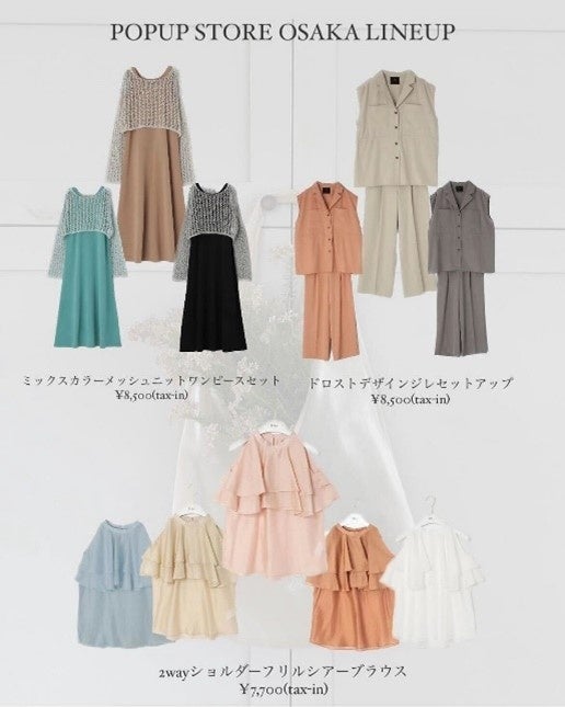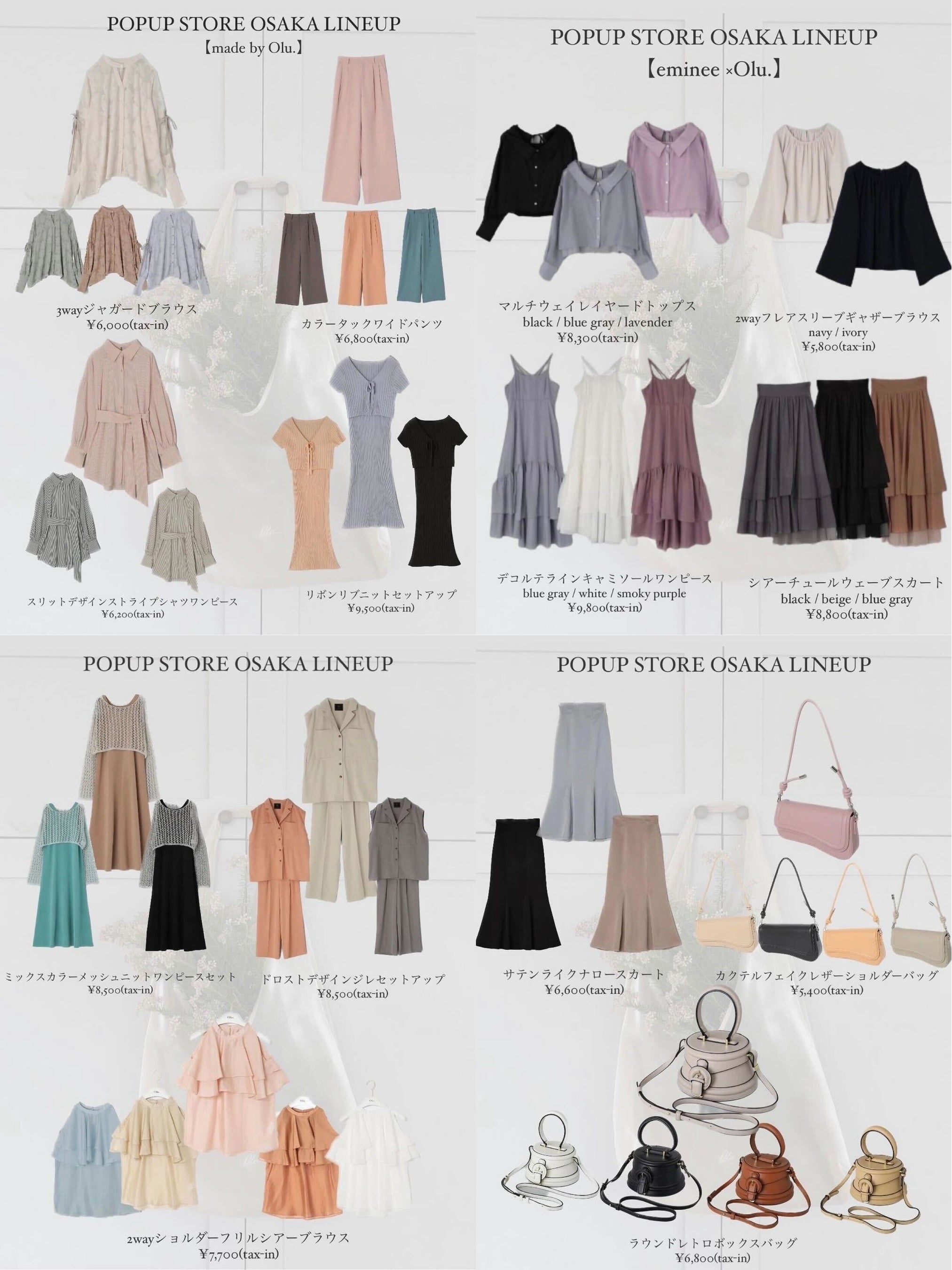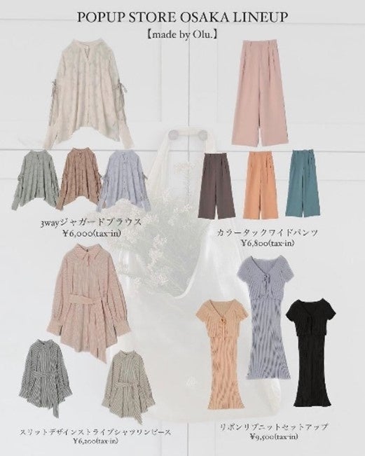 流行のセットアップやジャガードブラウスなど夏が待ち遠しくなるオリジナルアイテムのほか、人気YouTuber“えみ姉(えみねえ)”と共同制作した「eminee×Olu.」のコラボアイテムもご用意。『Olu.』のミッション“自分を大切にする時間をお届けする”を感じていただける空間となっており、InstagramをはじめとしたSNSで若い世代を中心に話題となっている商品の数々を、実際にお手に取ってご覧いただくことができます。
