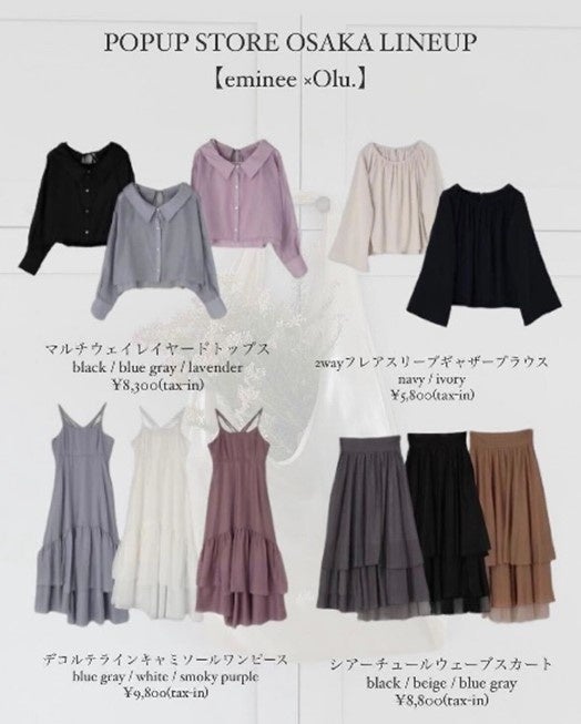 ■「eminee×Olu.」コラボ商品:マルチウェイレイヤードトップス、2wayフレアスリーブギャザーブラウス、デコルテラインキャミソールワンピース、シアーチュールウェーブスカート