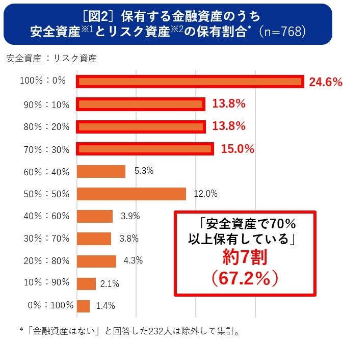 保有する金融資産のうち安全資産※1とリスク資産※2の保有割合を問う質問では、金融資産の70%以上を“安全資産”として保有する人が約7割(67.2%)いることが明らかに。