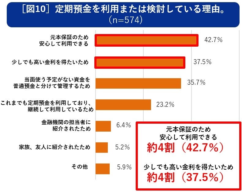 定期預金を利用する理由は「元本保証のため安心して利用できる」と「少しでも高い金利を得たいため」と回答した人がそれぞれ約4割(42.7%、37.5%)。