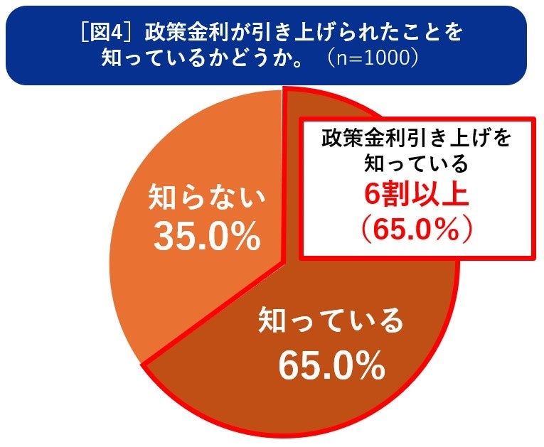マイナス金利政策の解除により政策金利が引き上げられたことを認知している人は6割以上(65.0%)。一方で、普段使っている普通預金、定期預金の金利を確認していない人は6割以上(65.9%)。