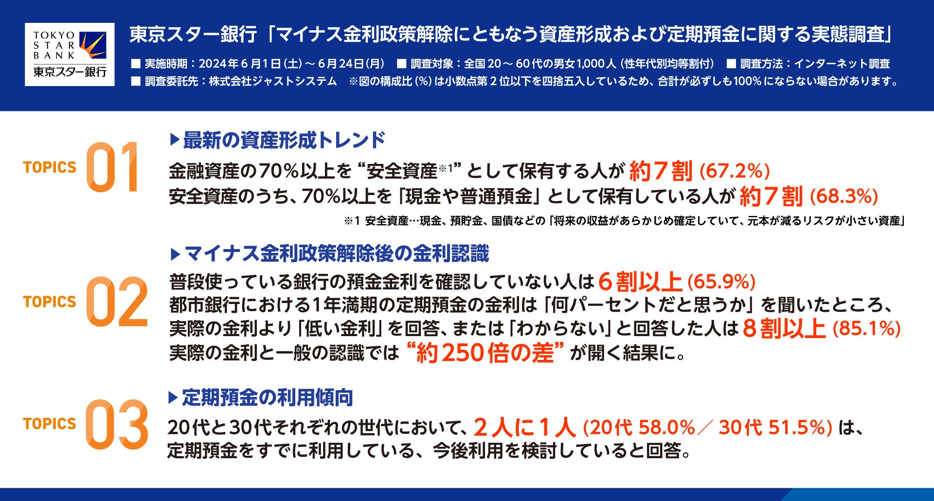 株式会社東京スター銀行(東京都港区、代表執行役頭取 伊東 武)は、全国20~60代の男女を対象に「マイナス金利政策解除にともなう資産形成および定期預金に関する実態調査」を実施しました。本調査では、17年ぶりに引き上げられた金利に対する生活者の理解度や定期預金の利用意向について、調査データを元に分析しました。