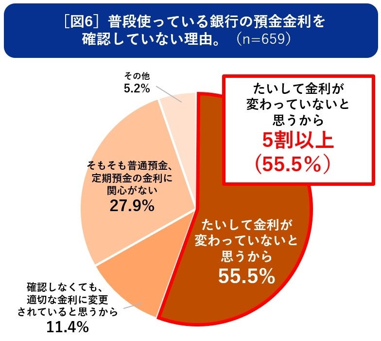 預金金利を確認していない理由は、「たいして金利が変わっていないと思うから」が5割以上(55.5%)。